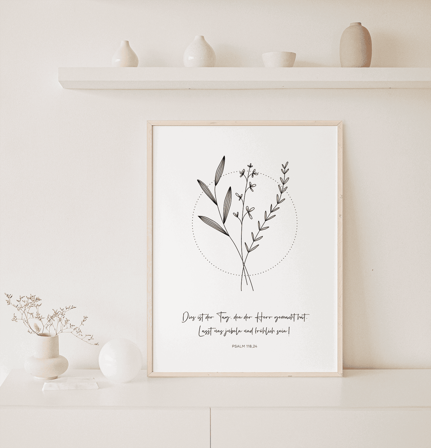 Das christliche Poster mit dem Bibelvers “Dies ist der Tag, den der Herr gemacht hat. Lasst uns jubeln und fröhlich sein. Psalm 118,24” ist eine stilvolle Deko für dein Zuhause oder wunderbares Geschenk zu vielen Anlässen.