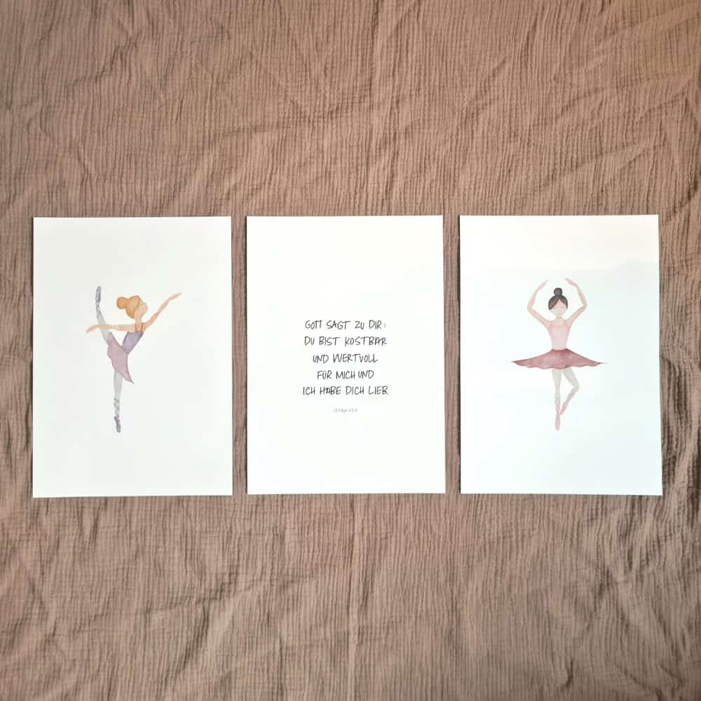 Du erhältst 3 Poster im DIN-A4-Format (1x Ballerina blond, 1x Bibelvers, 1x Ballerina dunkelhaarig). Sie sind auf stabilen Cremekarton gedruckt, sodass sie auch in einer Posterleiste stabil an der Wand hängen.