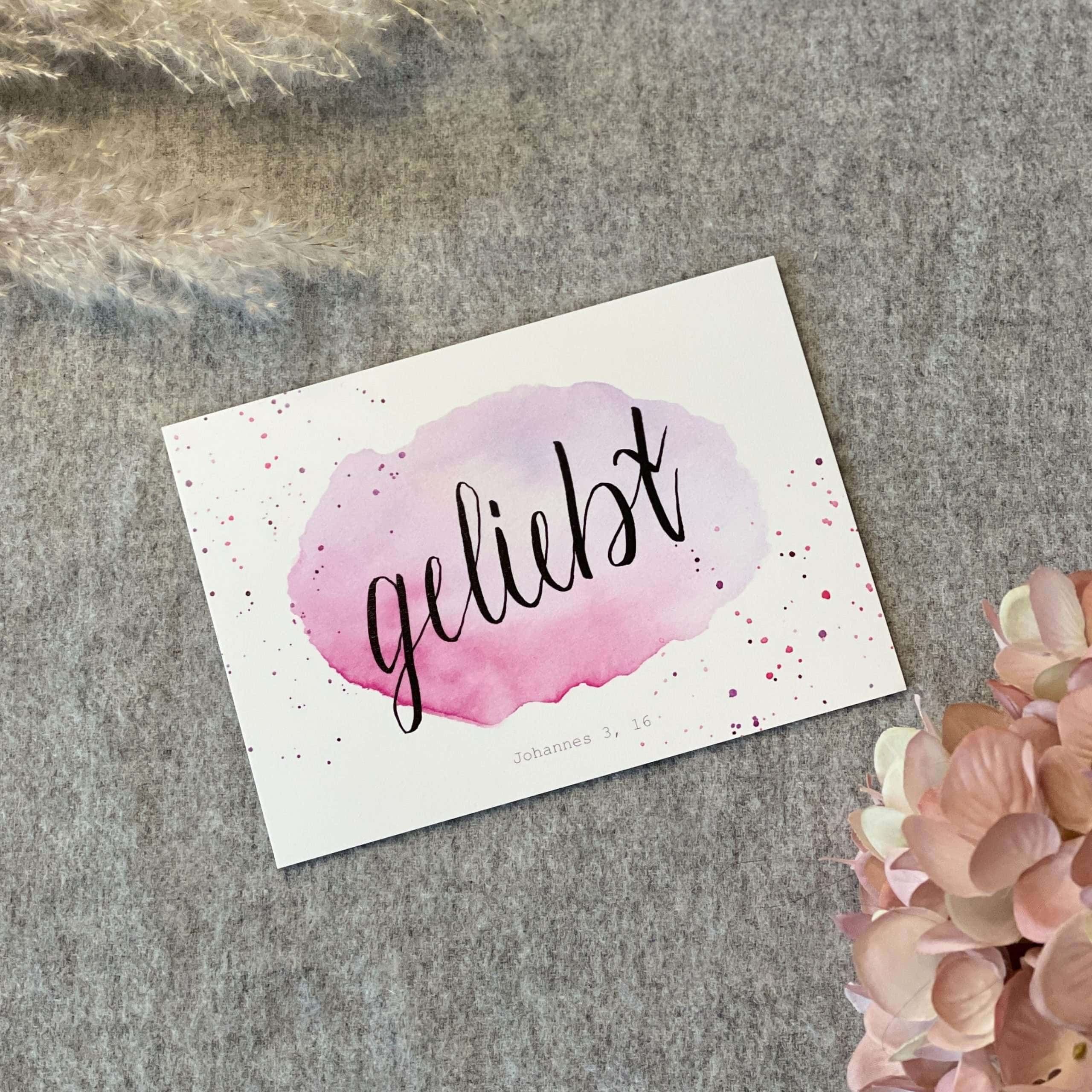 -“geliebt” nimmt Bezug auf die Bibelstelle Johannes 3,16. Die Bibelstelle ist in einem dezenten grau am unteren Rand der Karte aufgedruckt