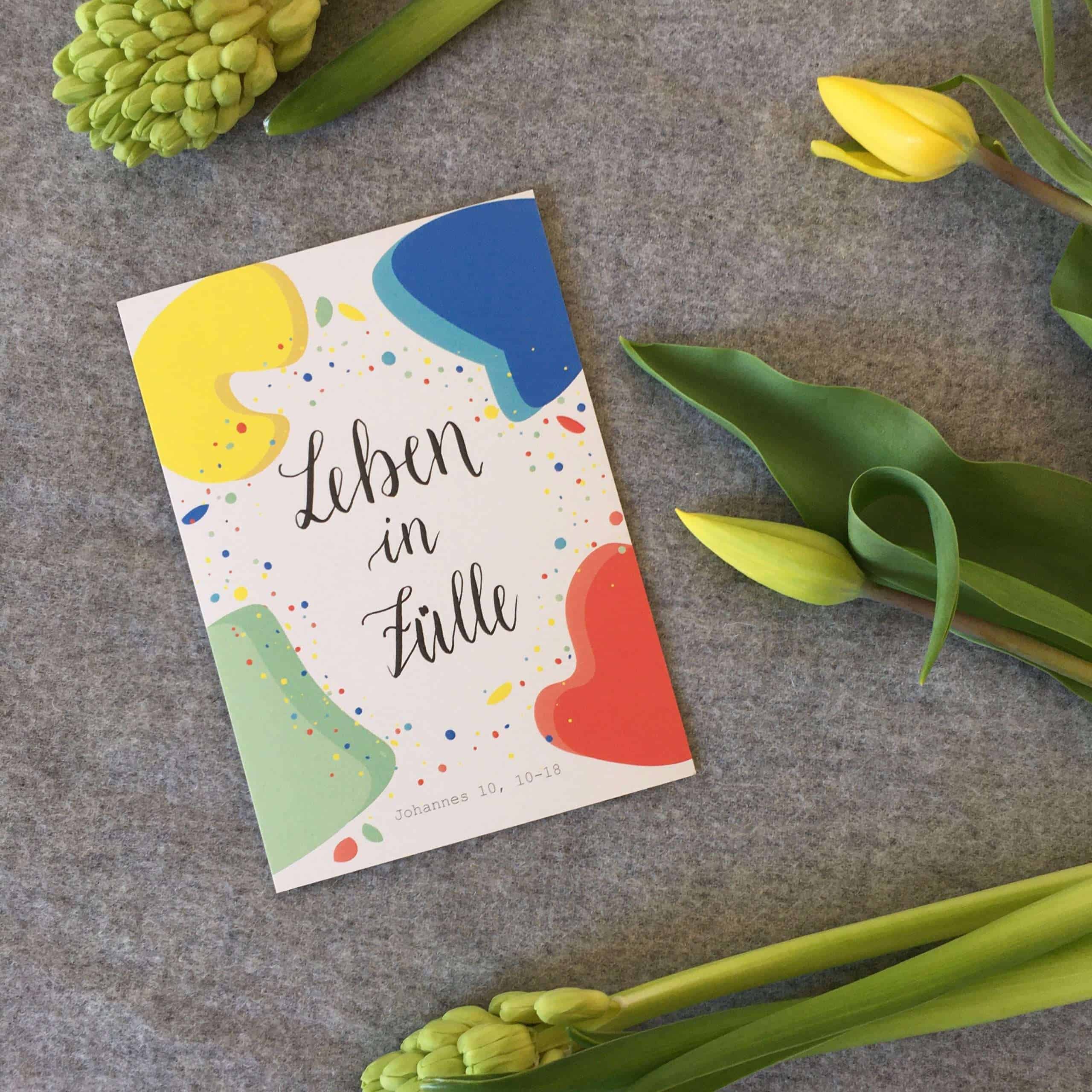 – “Leben in Fülle” nimmt Bezug auf die Bibelstelle Johannes 10,10-18. Die Bibelstelle ist in einem dezenten grau am unteren Rand der Karte aufgedruckt.