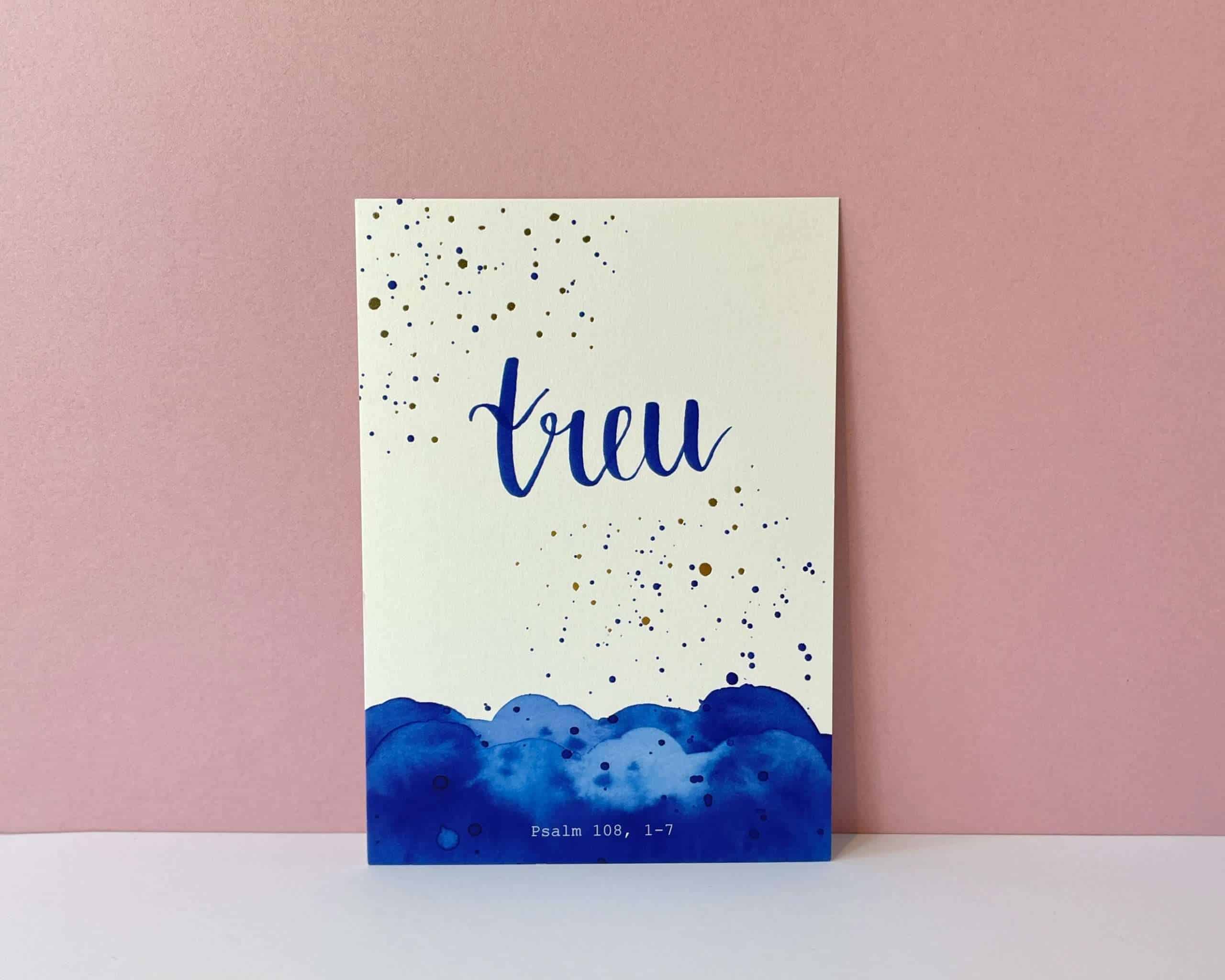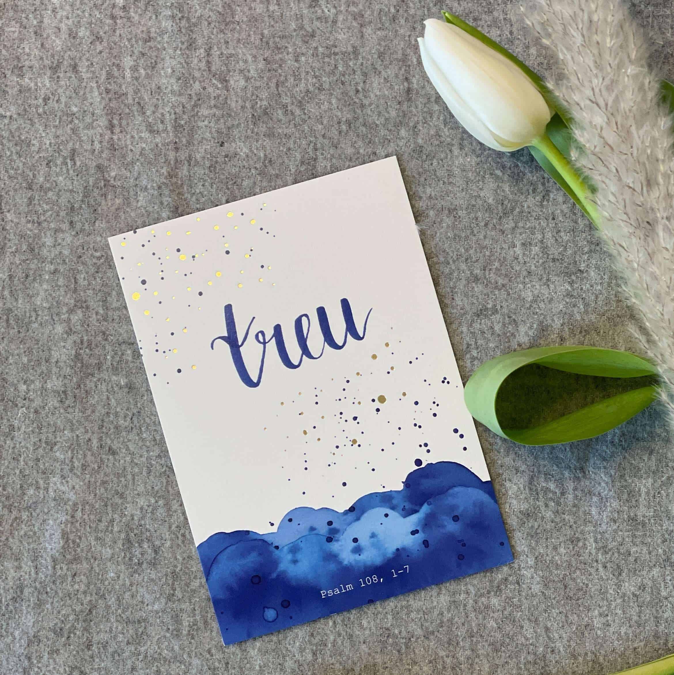 – “treu” nimmt Bezug auf die Bibelstelle Psalm 108, 1-7. Die Bibelstelle ist in einem dezenten grau am unteren Rand der Karte aufgedruckt
