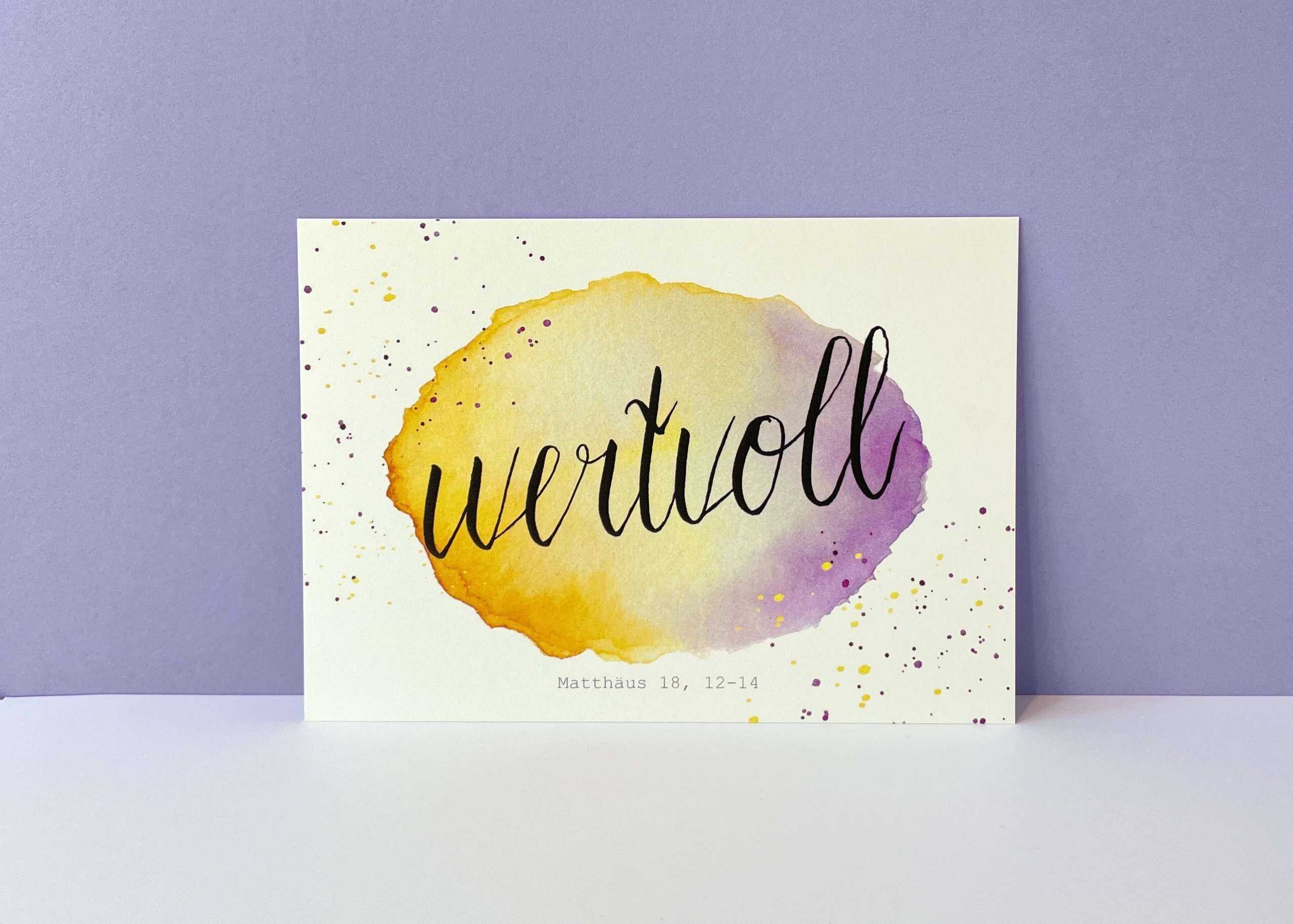 – “Wertvoll” nimmt Bezug auf die Bibelstelle Matthäus 18, 12-14. Die Bibelstelle ist in einem dezenten grau am unteren Rand der Karte aufgedruckt