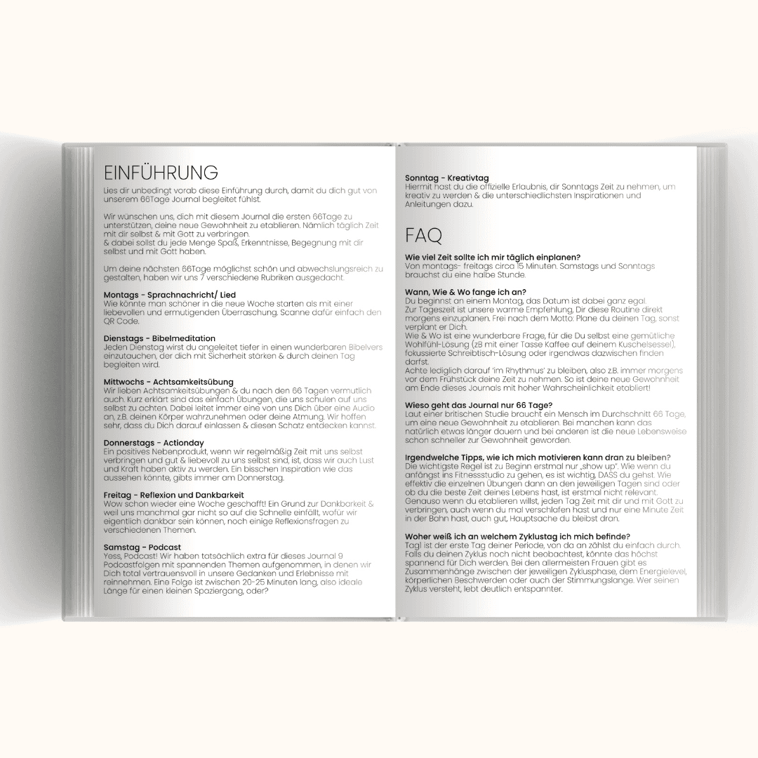 Und um dich dabei zu unterstützen es zu deiner Routine zu machen, täglich ca. 10 min Zeit mit dir und Gott zu verbringen, haben Sarina und ich ein 66 Tage Journal gestaltet.