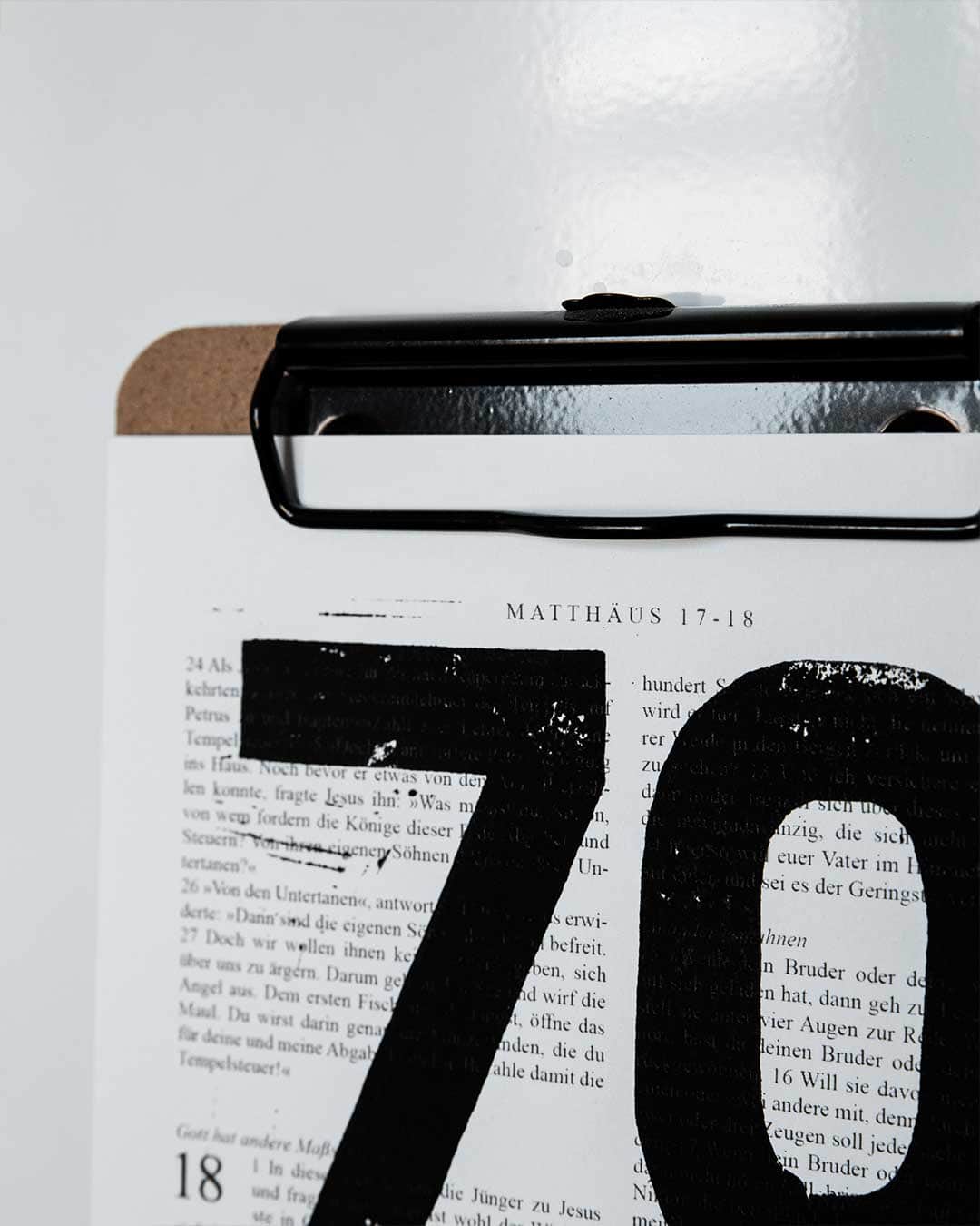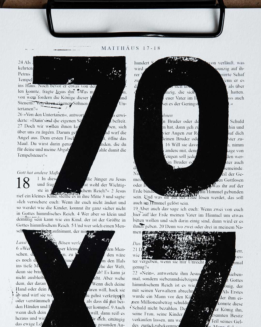 BIBELTEXT. das Druckmotiv «70×7» ist von dem folgenden Bibelvers inspiriert: dann kam Petrus zu ihm und fragte: »Herr, wie oft soll ich jemandem vergeben, der mir unrecht tut? sieben Mal?« »nein!«, antwortete Jesus, »siebzigmal sieben Mal! / Matthäus 18.21-22