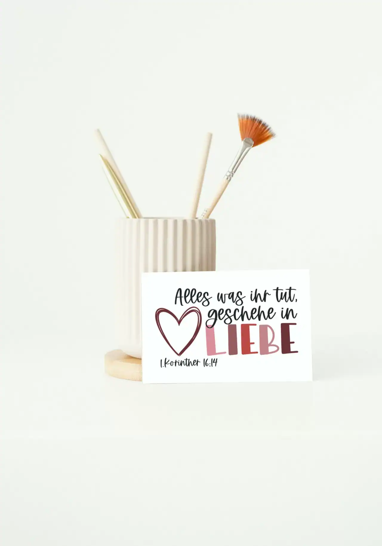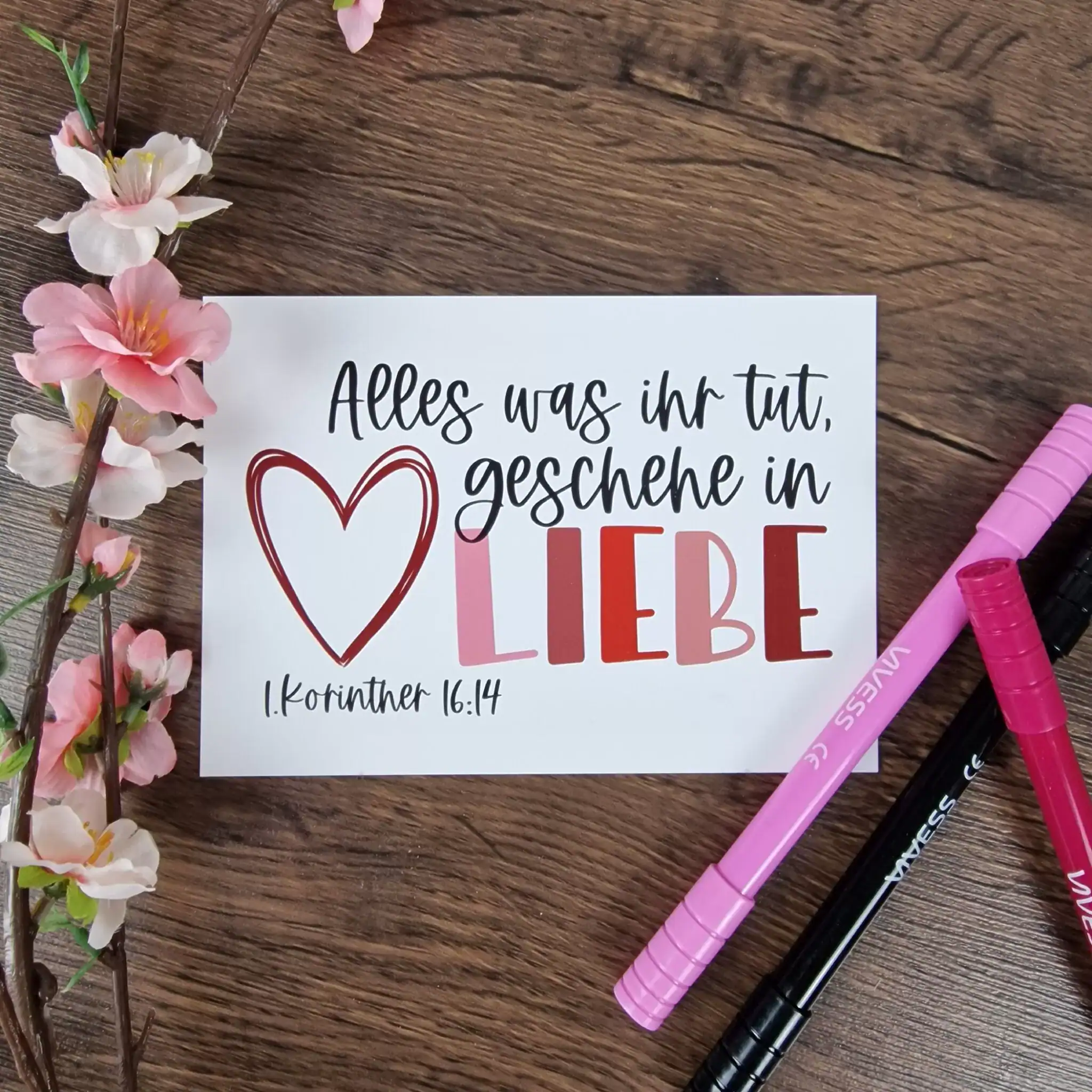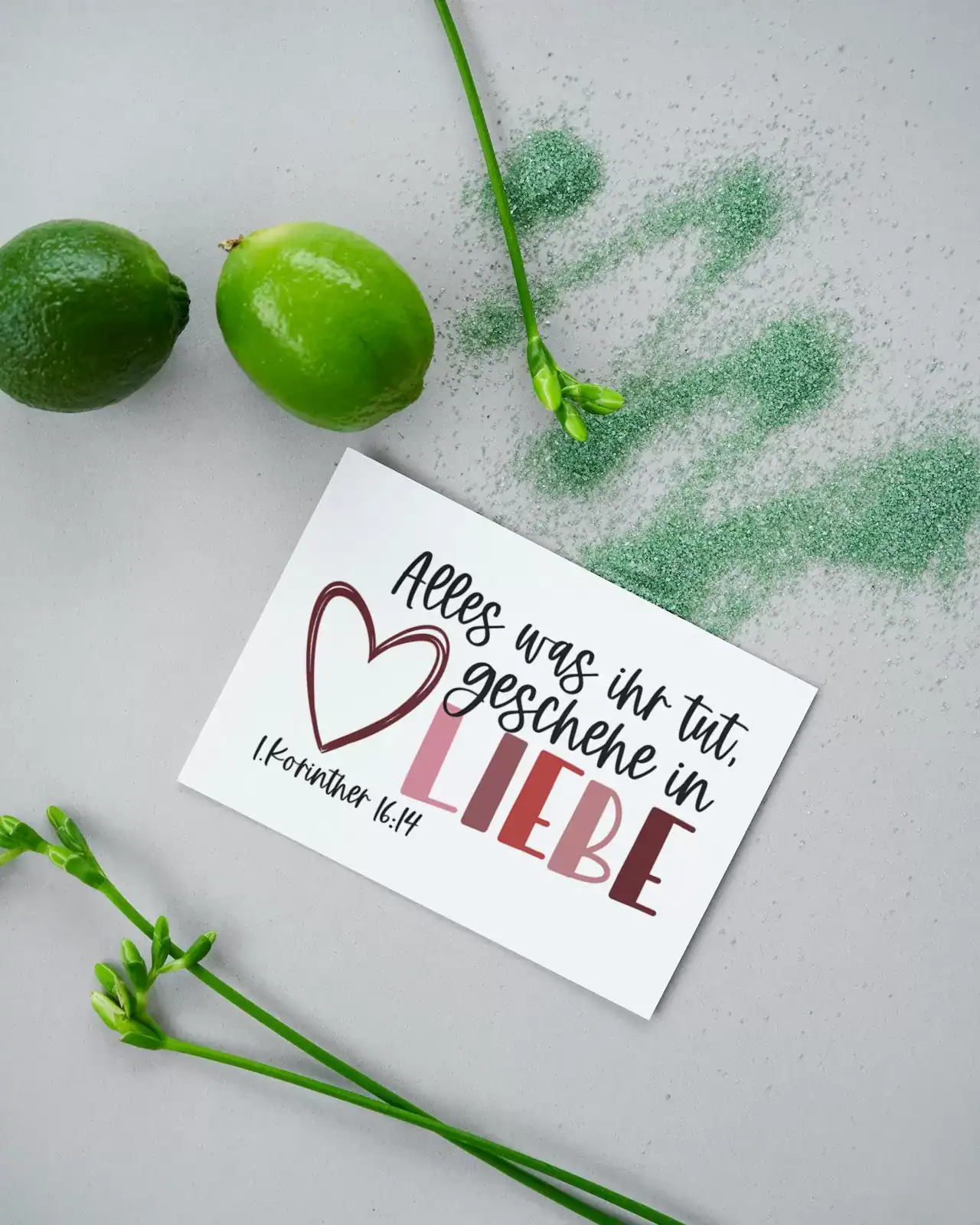 Der Bibelvers 1. Korinther 16, 14 inspiriert uns dazu, unser Leben auf Gottes Wort auszurichten und uns an seine Führung zu halten. Diese Postkarte eignet sich hervorragend als Inspiration für dich und deine Freunde.