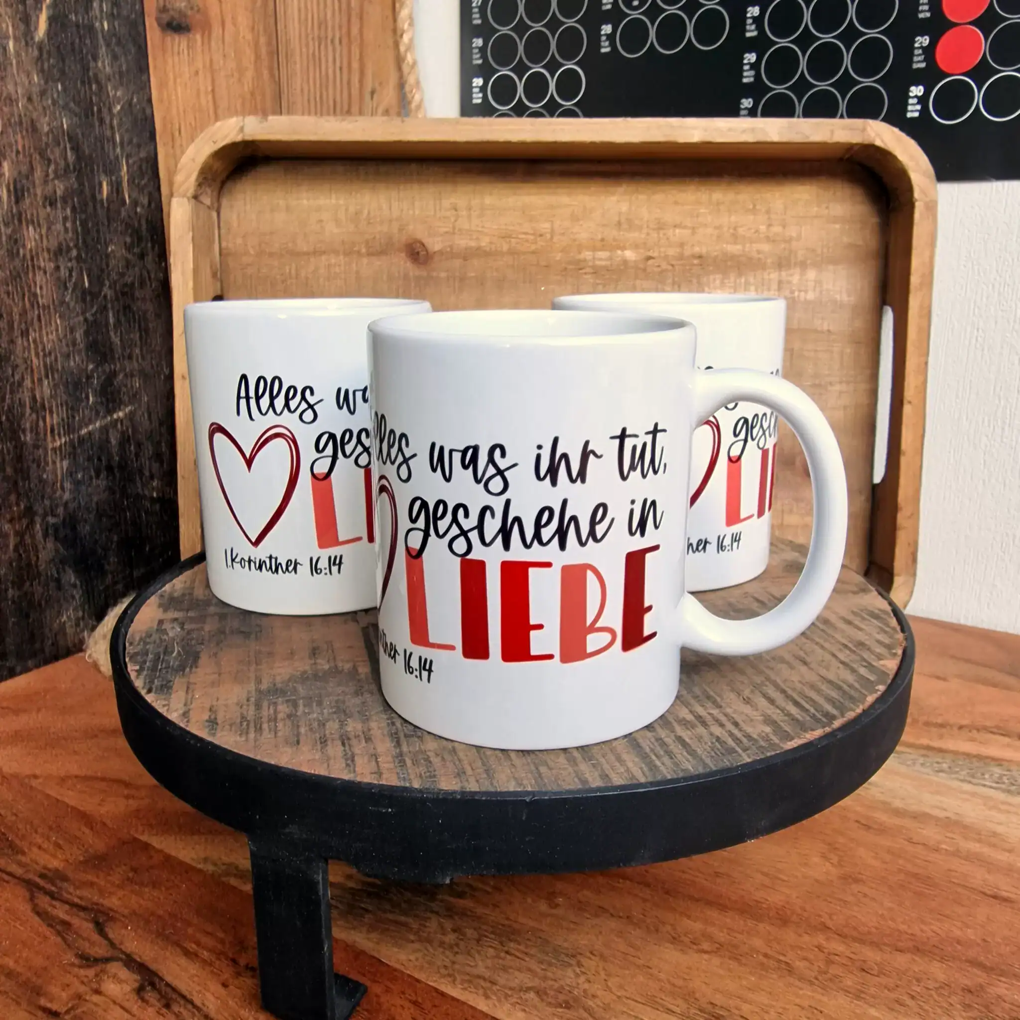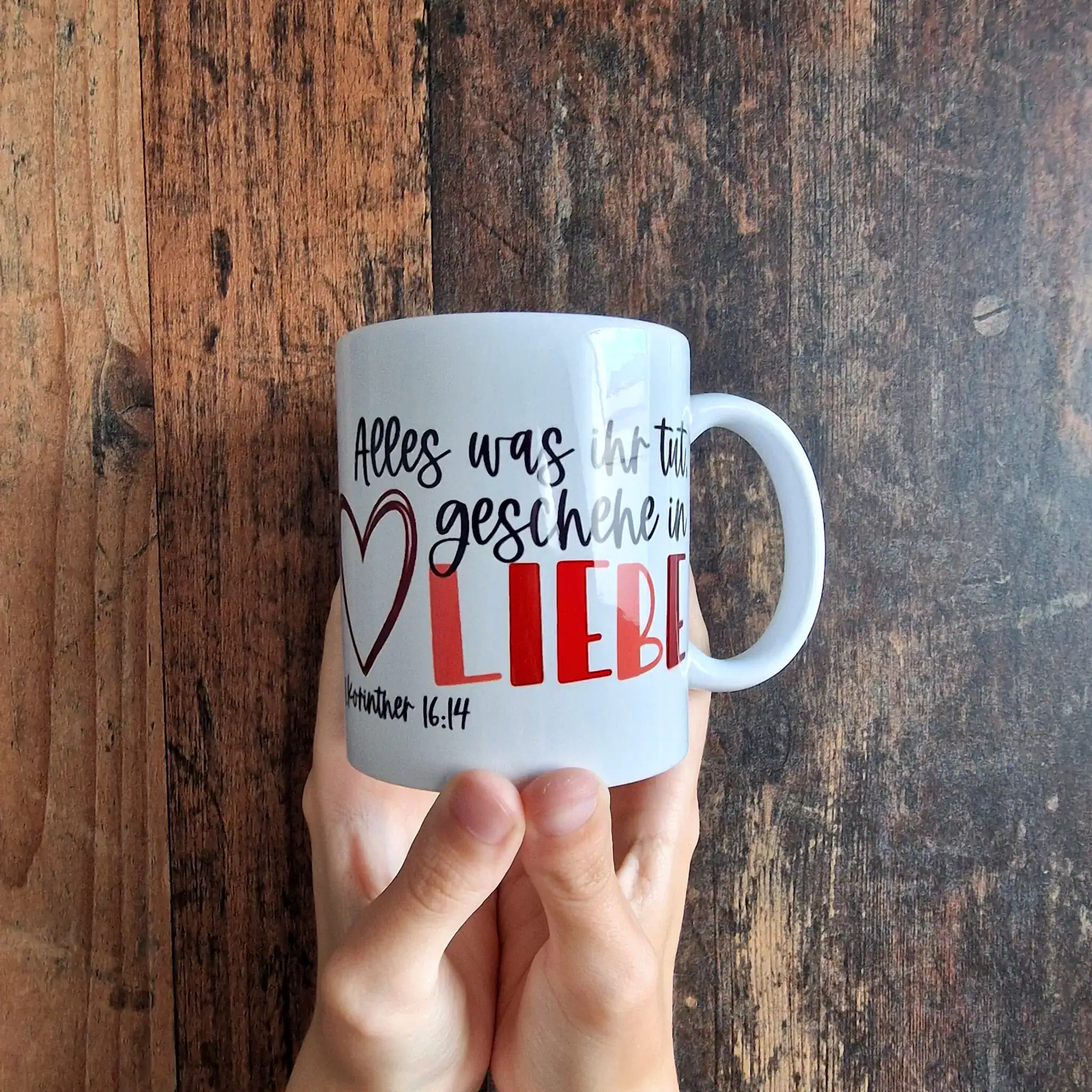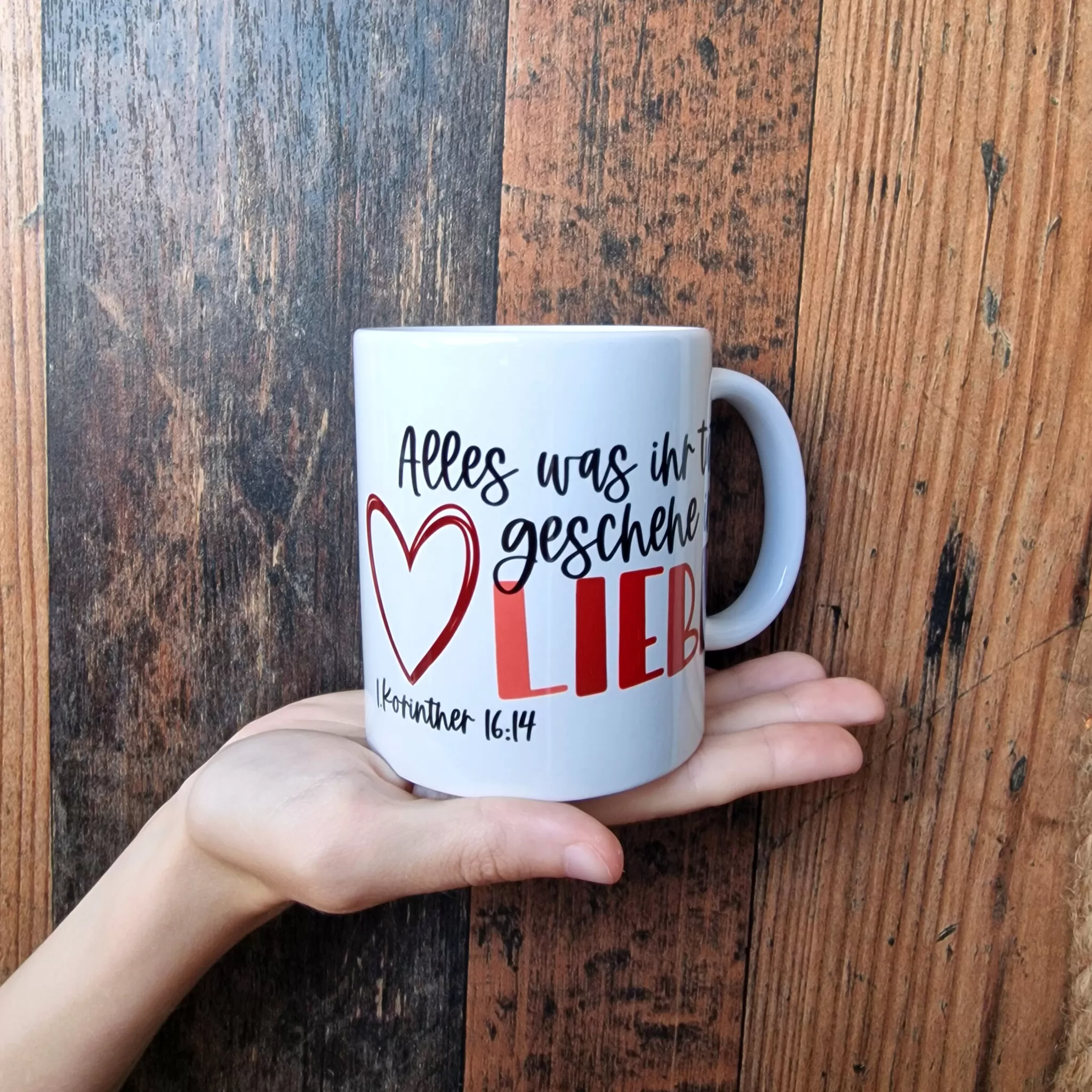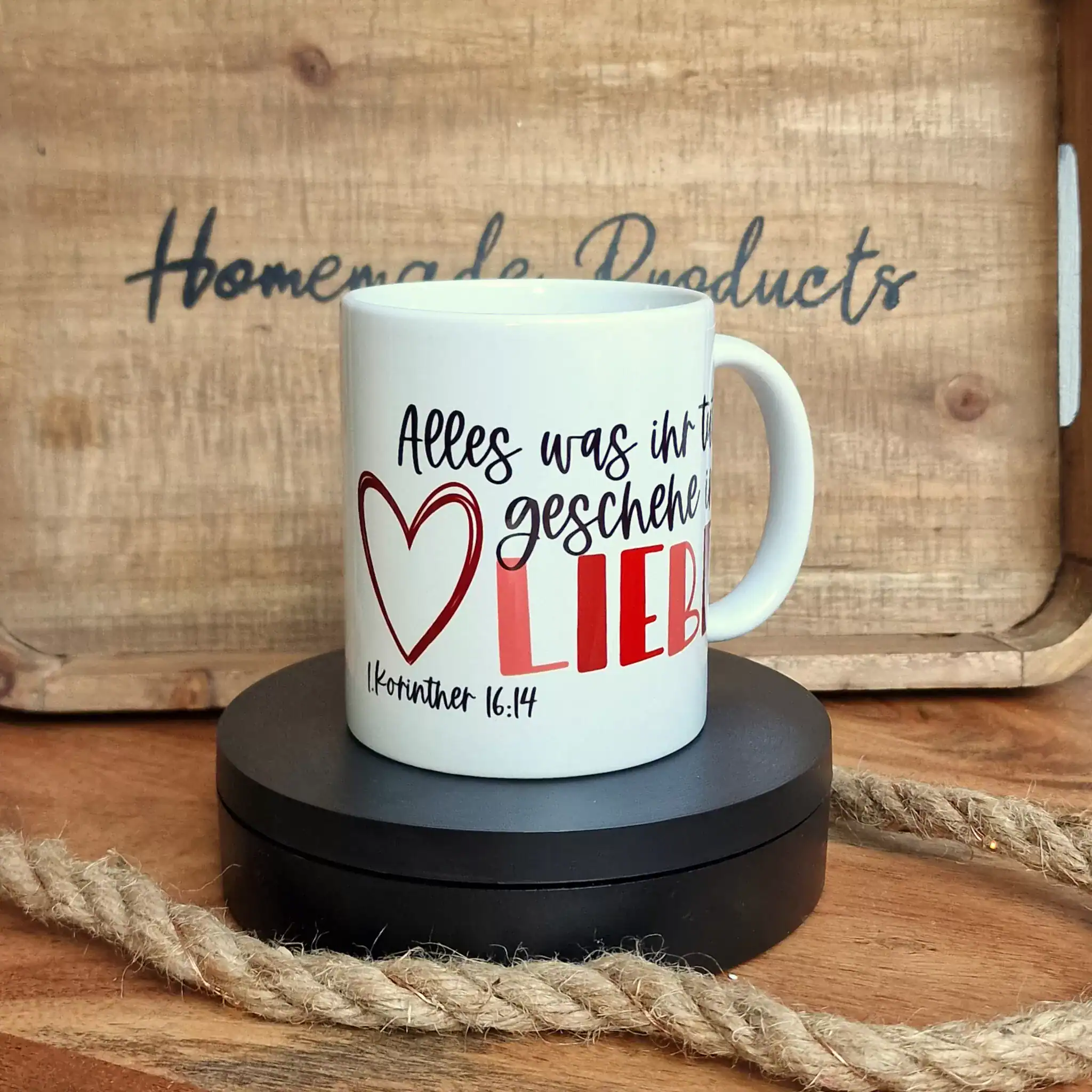 Unsere Tassen werden sorgfältig von Hand veredelt, um sicherzustellen, dass du ein einzigartiges und hochwertiges Produkt erhältst. Jede Tasse wird mit Liebe behandelt, um die Botschaft von 1. Korinther 16, 14 auf eine besondere Weise in dein Leben zu integrieren. Lass dich von dieser Tasse daran erinnern, dass Liebe der Schlüssel zu allem ist, was wir tun, und genieße deine Getränke in einem Gefäß, das nicht nur schön ist, sondern auch eine tiefgründige Bedeutung trägt.