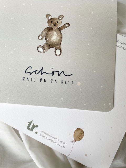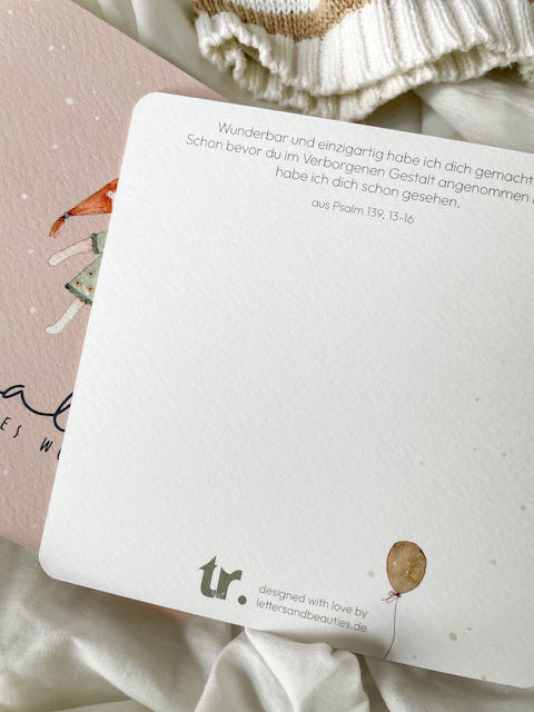 Mit diesen liebevoll gestalteten Karten kannst Du Dein Baby-Geschenk zur Geburt aufpeppen. Die Karte ist 13,5 x 13,5 cm groß und auf 300 g Tintoretto Gesso Papier gedruckt, das eine leichte Struktur aufweist, ähnlich einem Aquarellpapier. Dadurch kommen die in Aquarell gezeichneten Illustrationen besonders gut zur Geltung. Auf der Rückseite sind Verse aus Psalm 139 zu lesen.