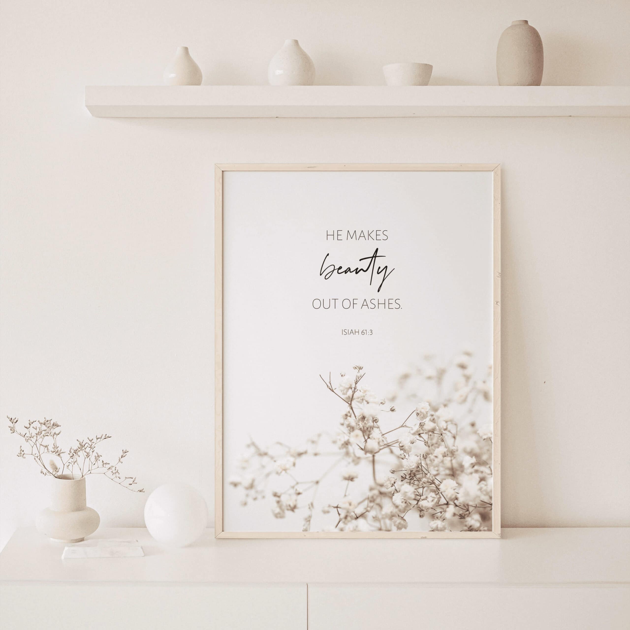 Das Poster „He makes beauty out of ashes. Isiah 61:3“ ist eine inhaltliche Zusammenfassung des Bibelverses aus Jesaja 61,3. Es ist ein schöner Blickfang für dein Zuhause oder ein wunderbares Geschenk.