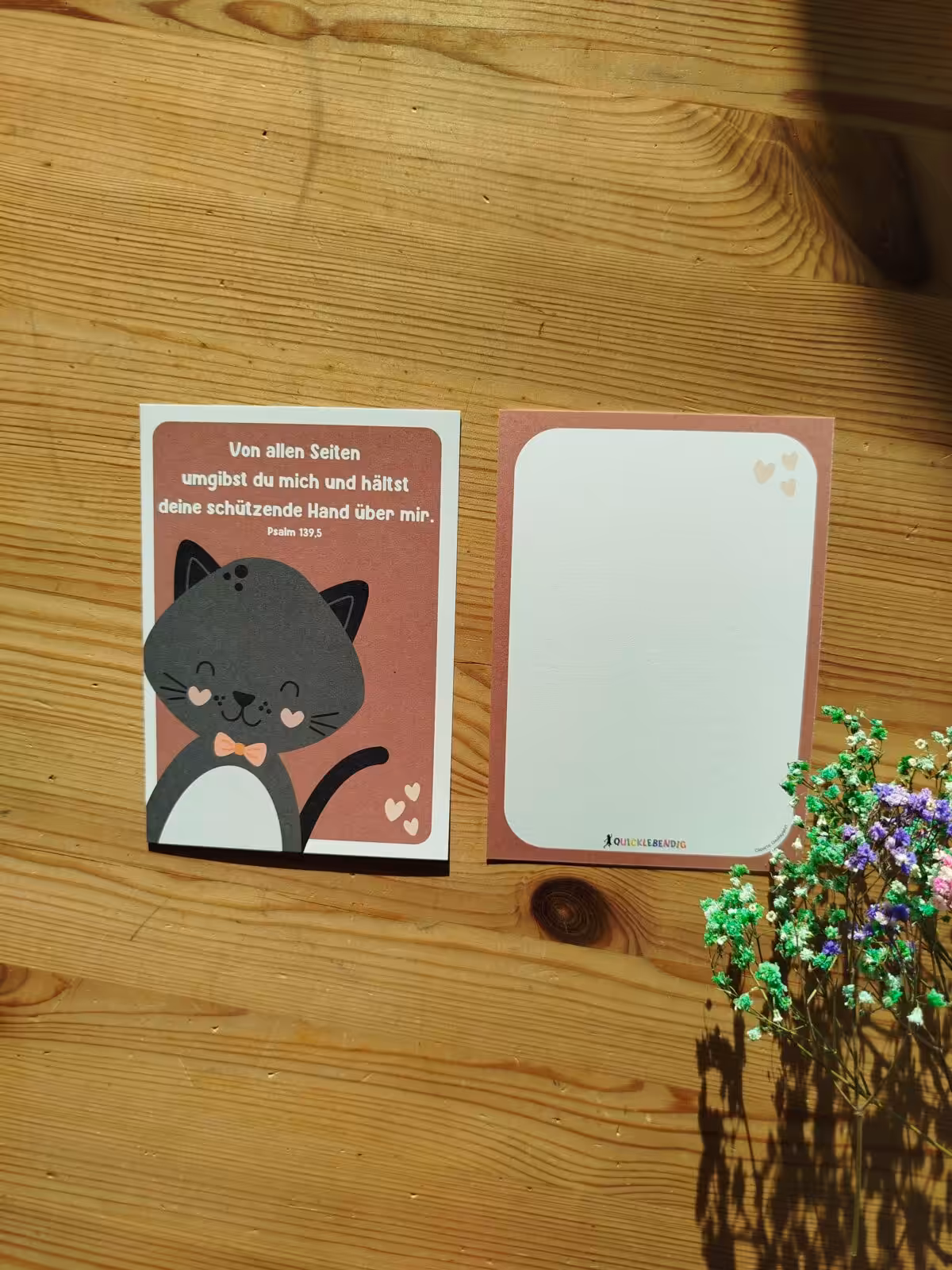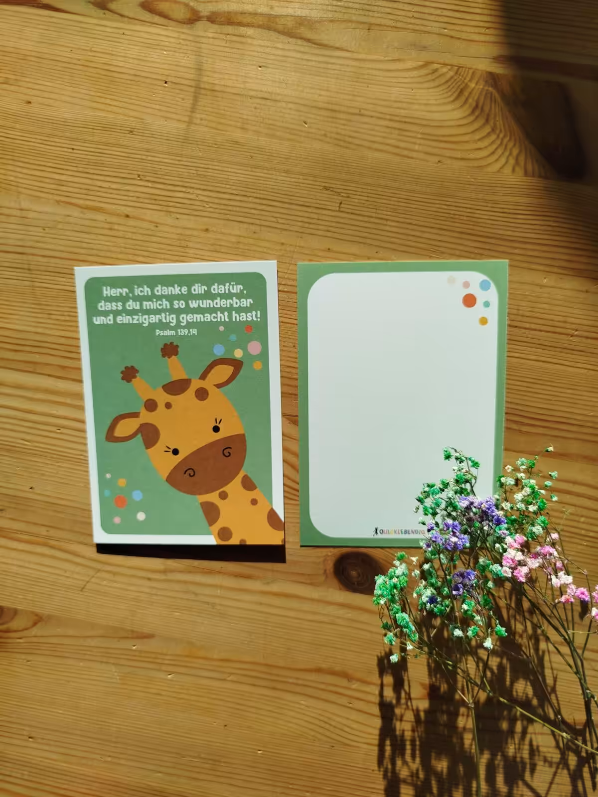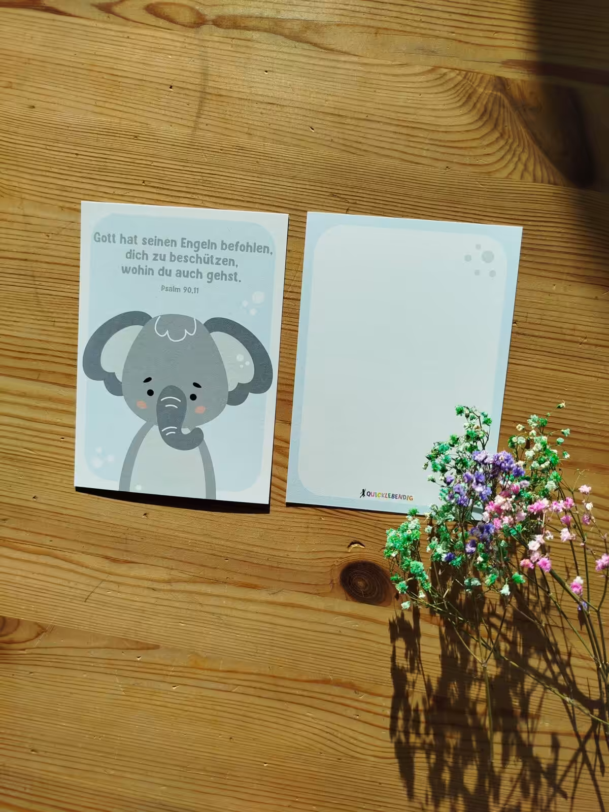 Auf der Vorderseite ist der Bibelvers mit einem Tier abgedruckt, auf der Rückseite findest du viel Platz zum schreiben.