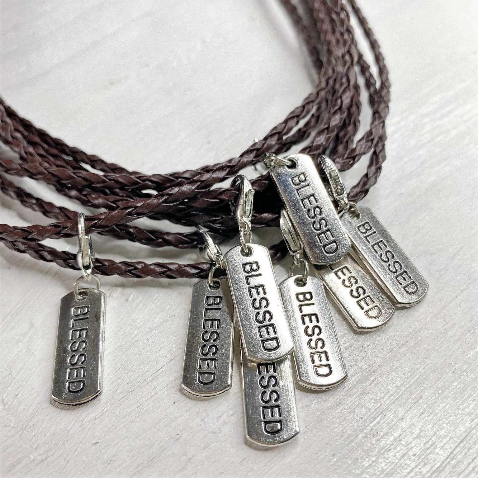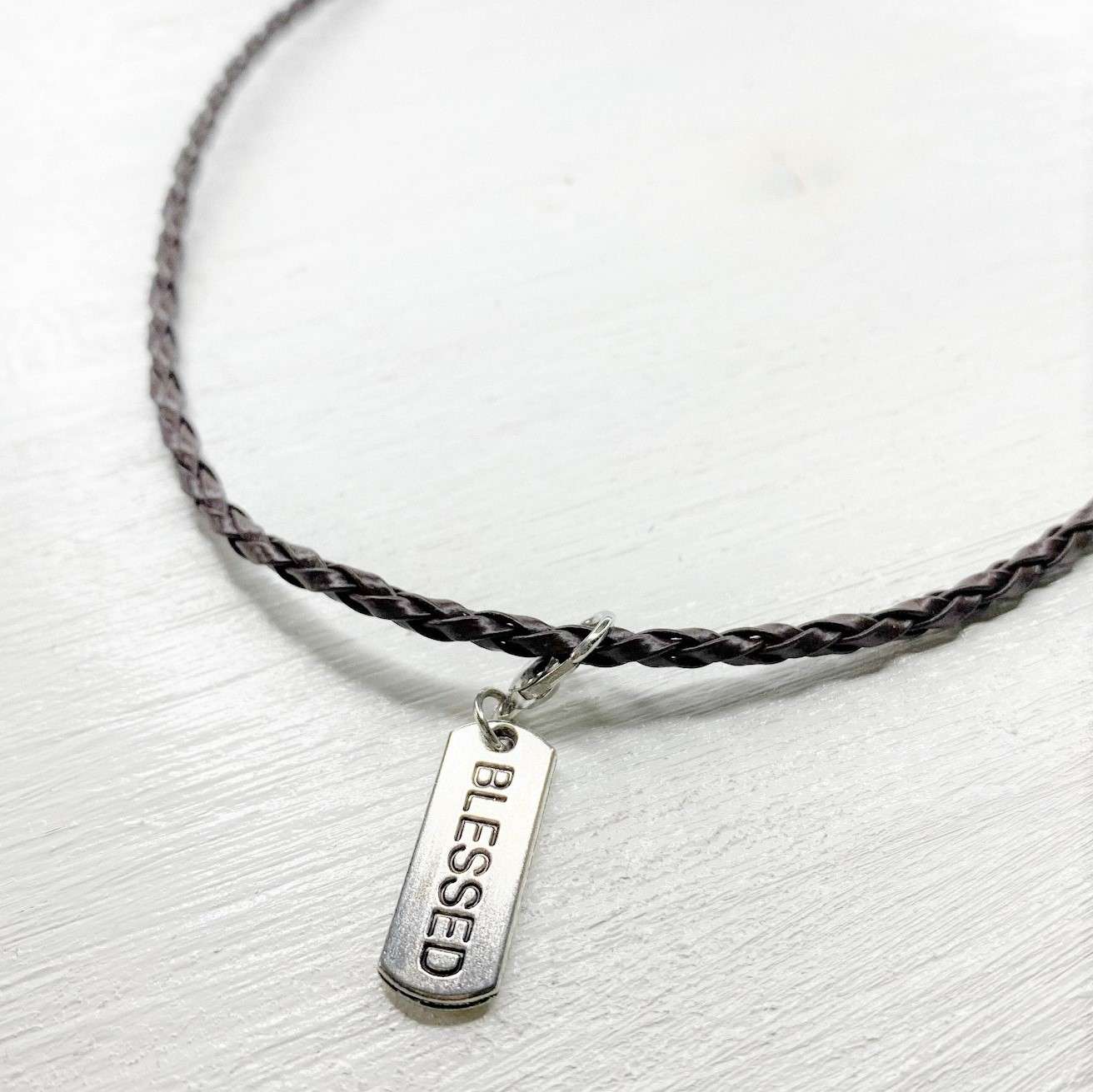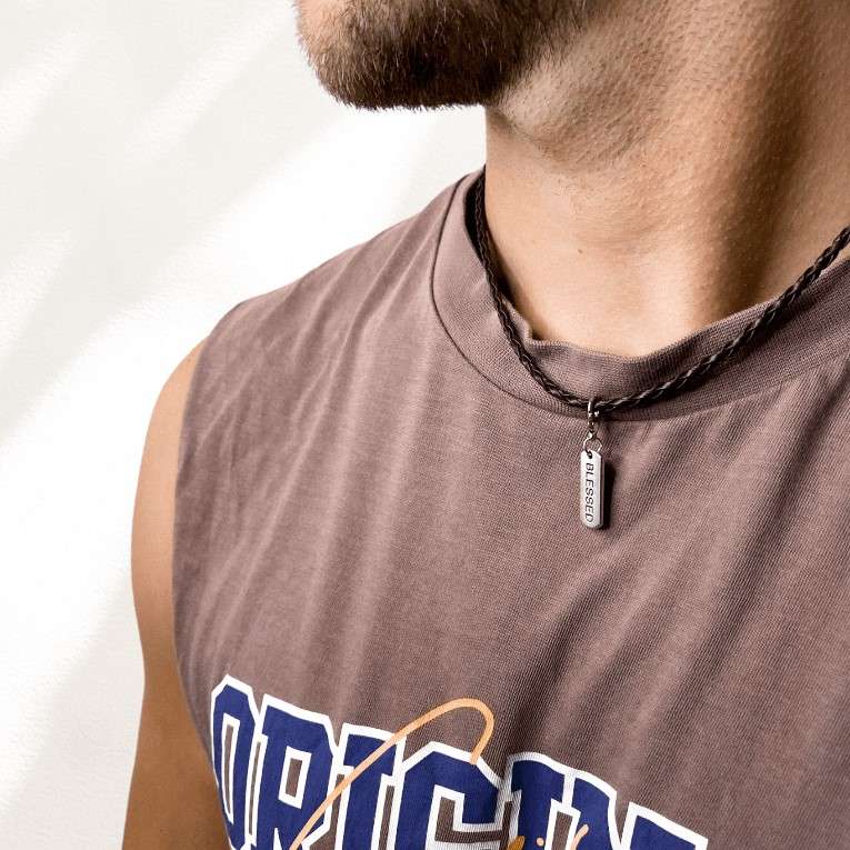 Das wurde auch langsam Zeit … schon lange brannte mir unter den Nägeln, endlich ein schlichtes und doch aussagekräftiges Schmuckstück für Männer in den Shop zu bringen. Et voilà! Die Kette und damit offiziell das erste Schmuckstück für Männer in diesem Shop besteht aus einem geflochtenen Kunstlederband mit silberfarbenem, graviertem „BLESSED“ – Anhänger. Sie ist größenverstellbar und kann lässig auf jedes T-Shirt, Tanktop oder auch auf einen Pulli getragen werden.
