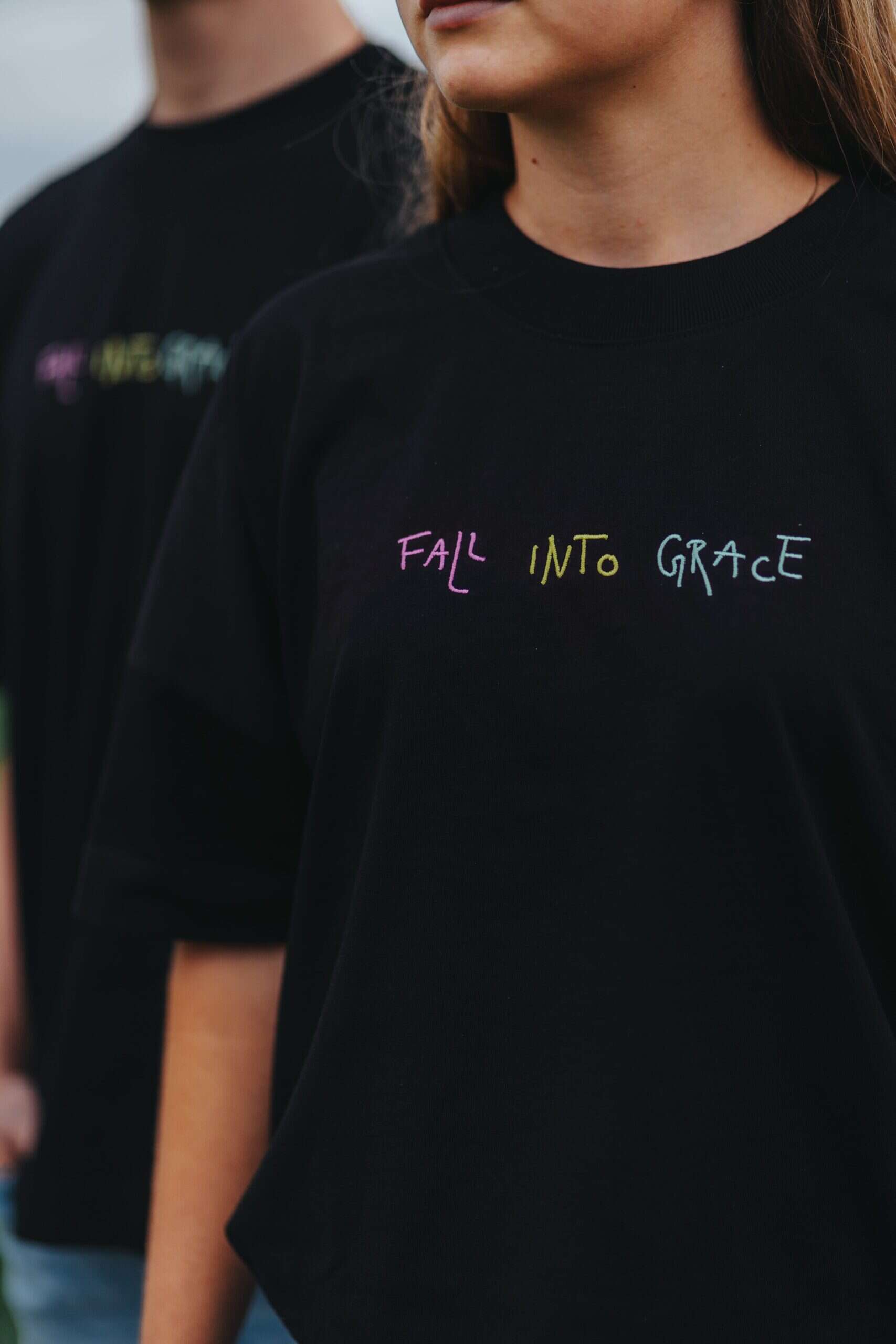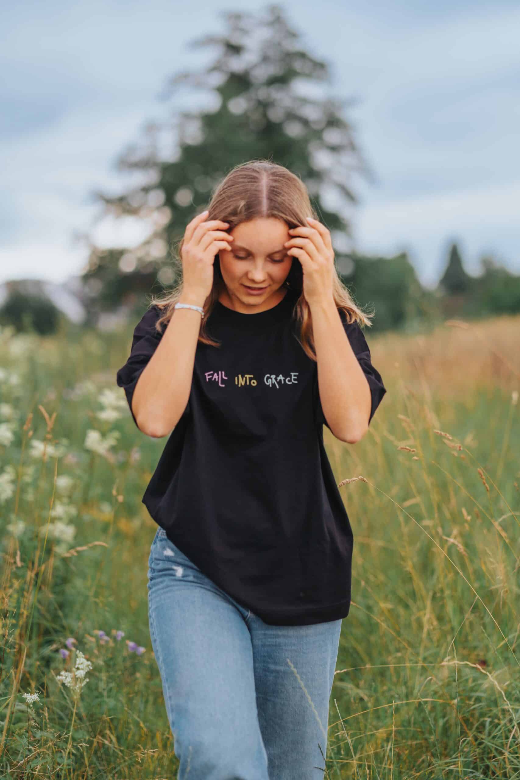 Fall into Grace | Christliches T-Shirt – oversized unisex – schwarz – Bio-Baumwolle mit Stick