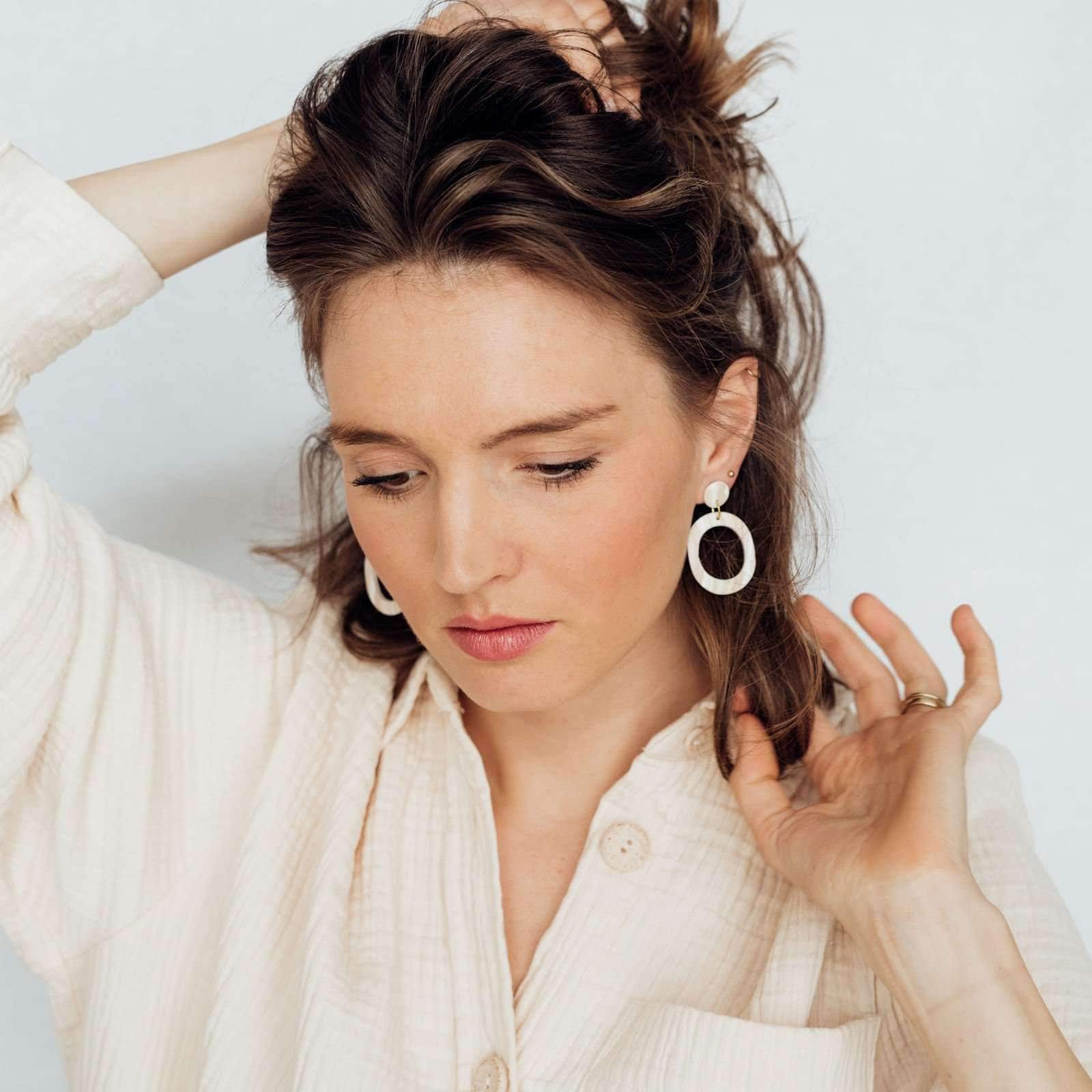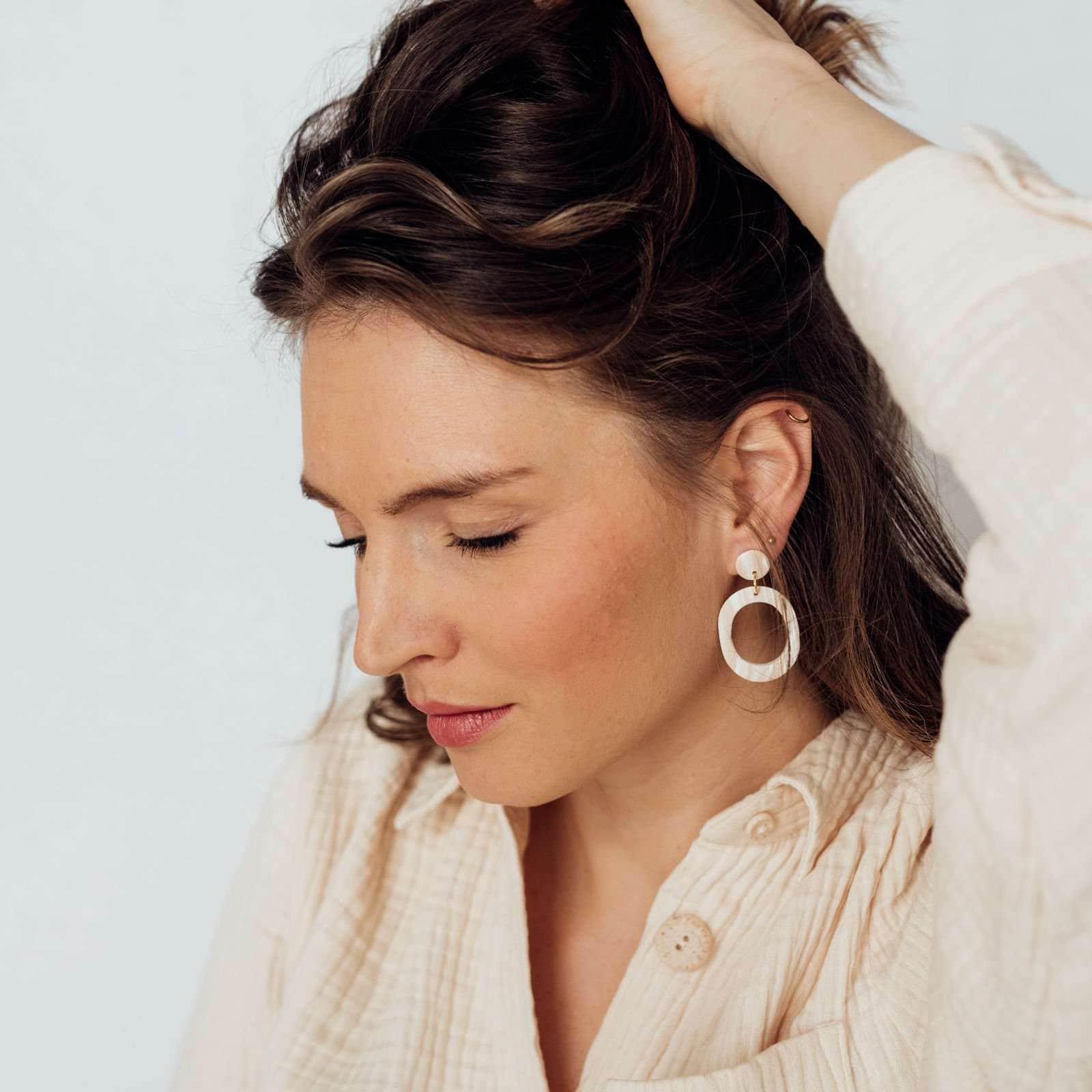 “Oval (with cutout)” transportiert Leichtigkeit und ist dennoch ein unschlagbarer Hingucker. Die Kombination aus Stabilität, Festigkeit, geringem Gewicht und großer Farbvielfalt macht das Polymer zu dem perfekten Material für Ohrringe. Die schlichte und zugleich edle Marmorierung gibt es in den Farben beige/weiß.