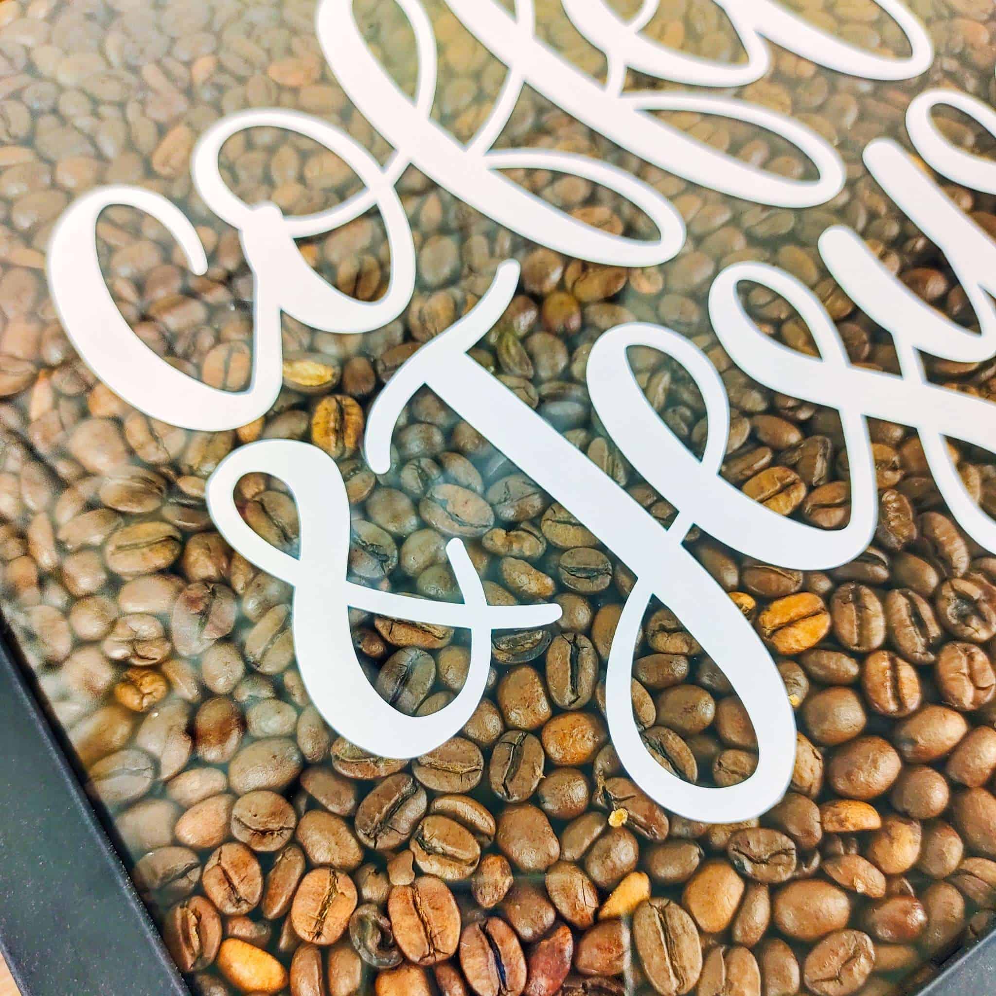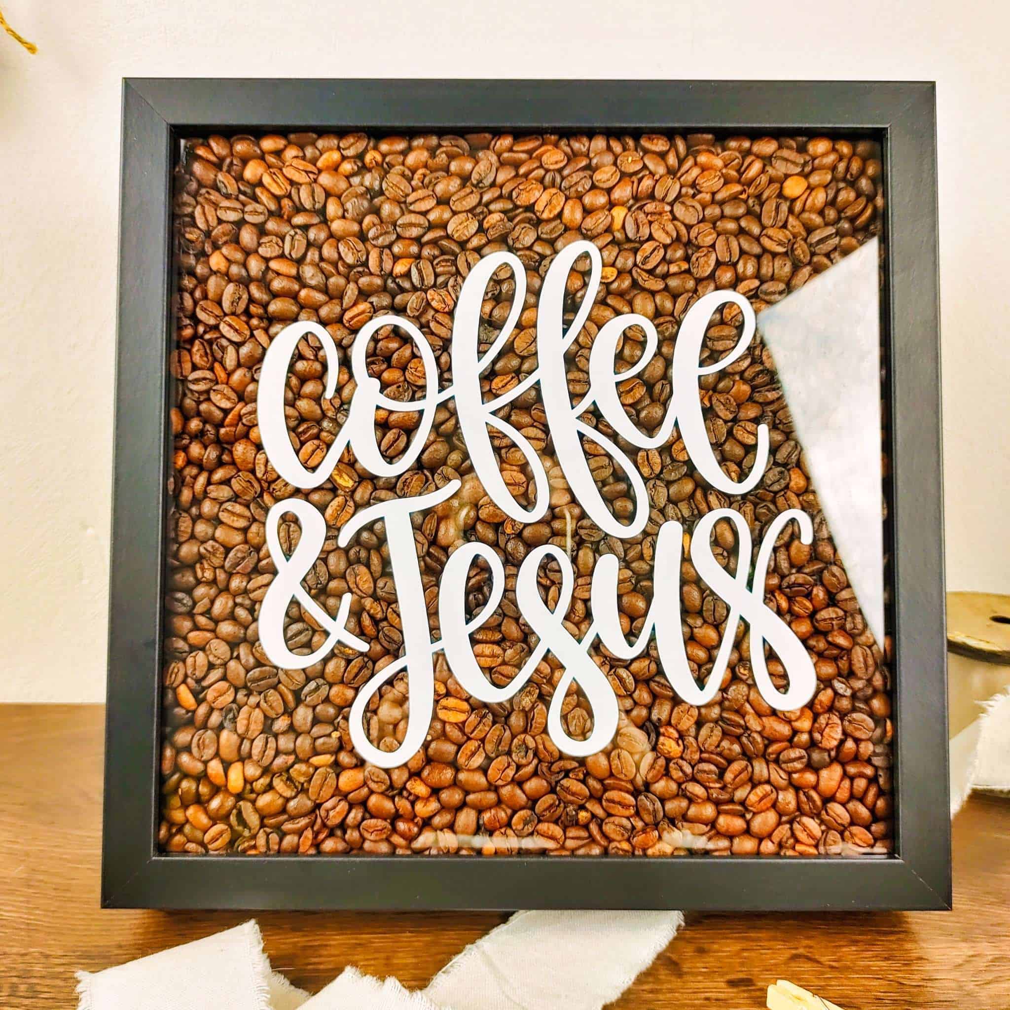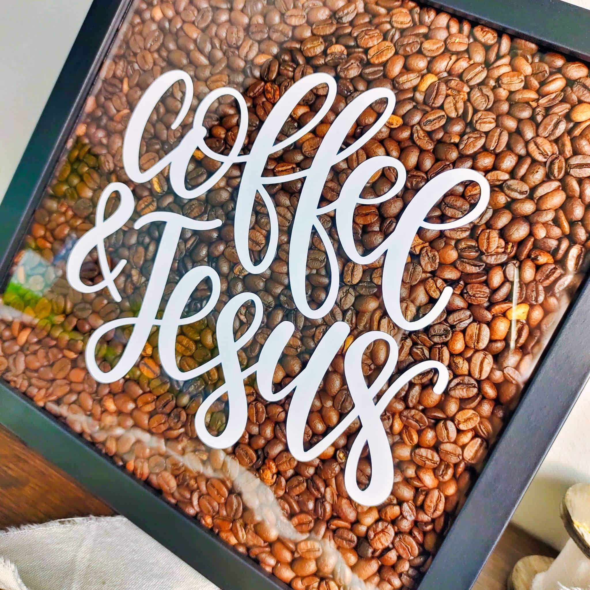 Die Shadow Box ist befüllt mit 1kg Kaffeebohnen. Der Text “coffee and jesus” wurde aus widerstandfähigen Vinyl geschnitten.