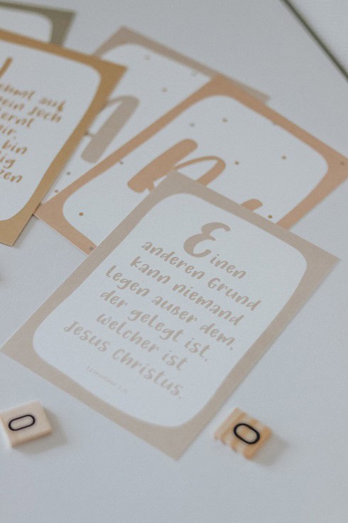 Zu jedem Buchstabe des gesamten Alphabets wurde jeweils ein Bibelvers auf die Rückseite gedruckt. So kann man mit den Kindern auch spielerisch das Wort Gottes erlernen und hoffentlich besser behalten.