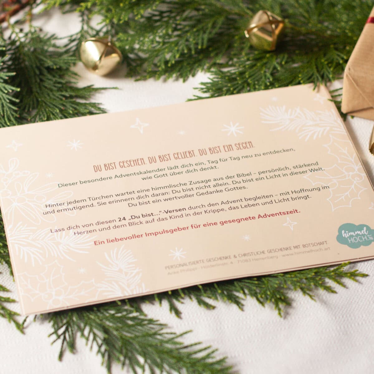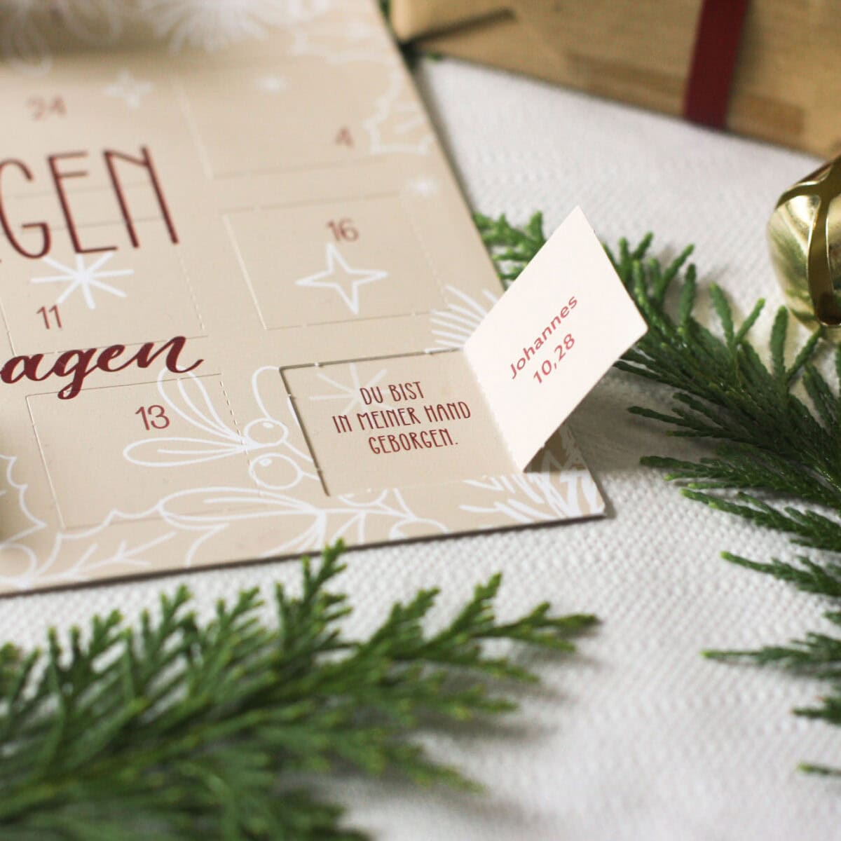 Lass dich von den täglichen Bibelversen begleiten und erlebe eine Adventszeit voller Ermutigung und Frieden. Bestelle jetzt deinen Adventskalender mit Bibelversen und starte mit uns in eine besinnliche und inspirierte Adventszeit.
