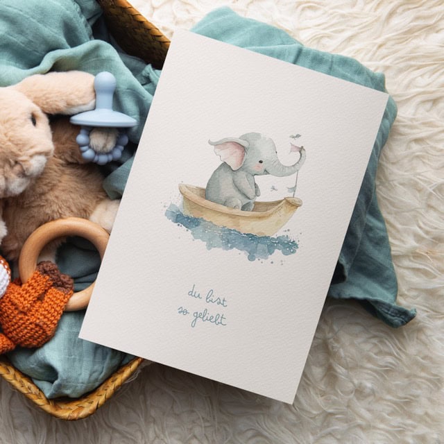 Das zarte Aquarellmotiv mit dem kleinen Elefanten in seinem Boot macht die Karte zu einem besonderen Blickfang – ideal zum Verschenken oder Einrahmen.