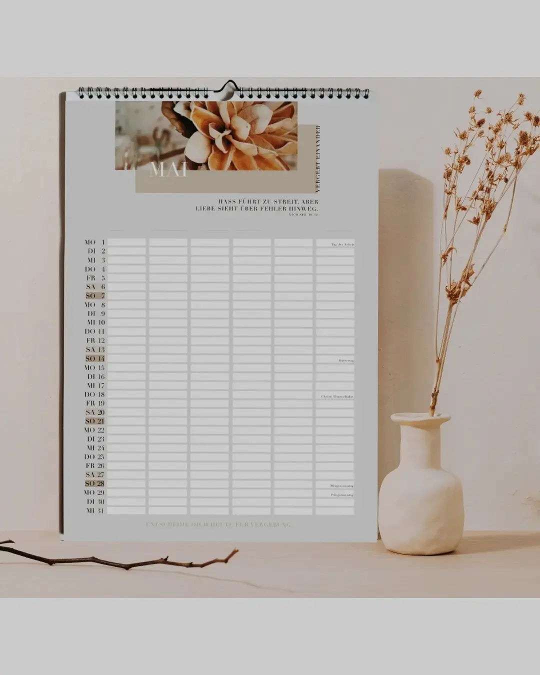 Der Kalender erhältst du als Wandkalender im A3 Hochformat mit einer schwarzen Spiralbindung und auf hochwertigem, mattem 250g Papier.