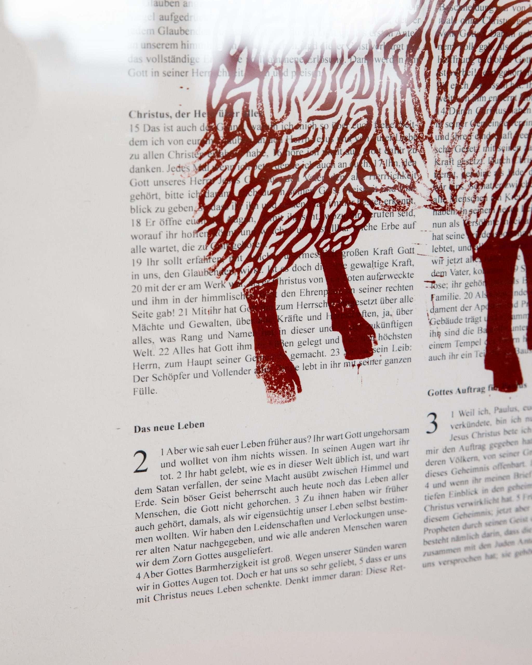 BIBELTEXT. das Druckmotiv «Gerettet» ist von dem folgenden Bibelvers inspiriert: denn nur durch seine unverdiente Güte seid ihr vom Tod gerettet worden. das ist geschehen, weil ihr an Jesus Christus glaubt. es ist ein Geschenk Gottes und nicht euer eigenes Werk. / Epheserbrief 2.8