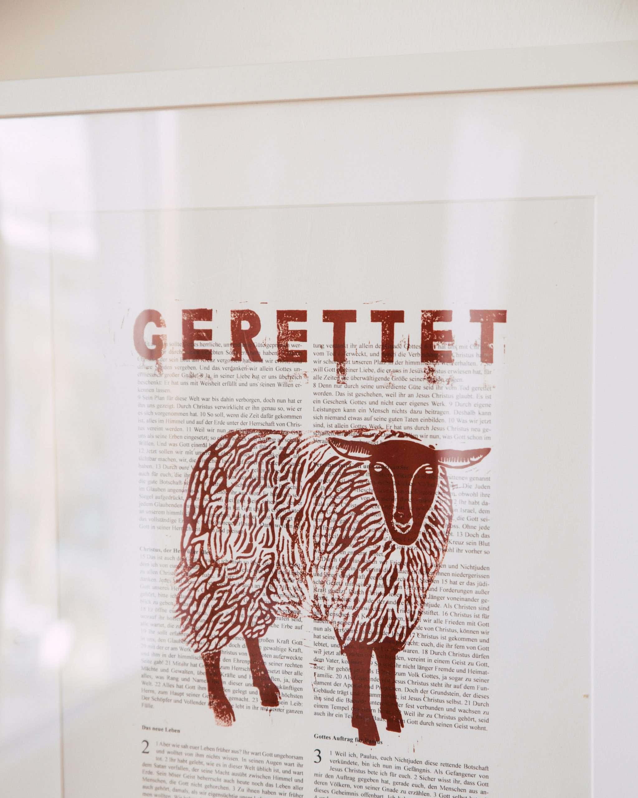 GERETTET. dieser Kunstdruck soll dich daran erinnern, dass du durch Jesus gerettet bist und er dir ewiges Leben schenkt. das Schaf symbolisiert unsere Identität und erinnert an Jesus als unseren guten Hirten.