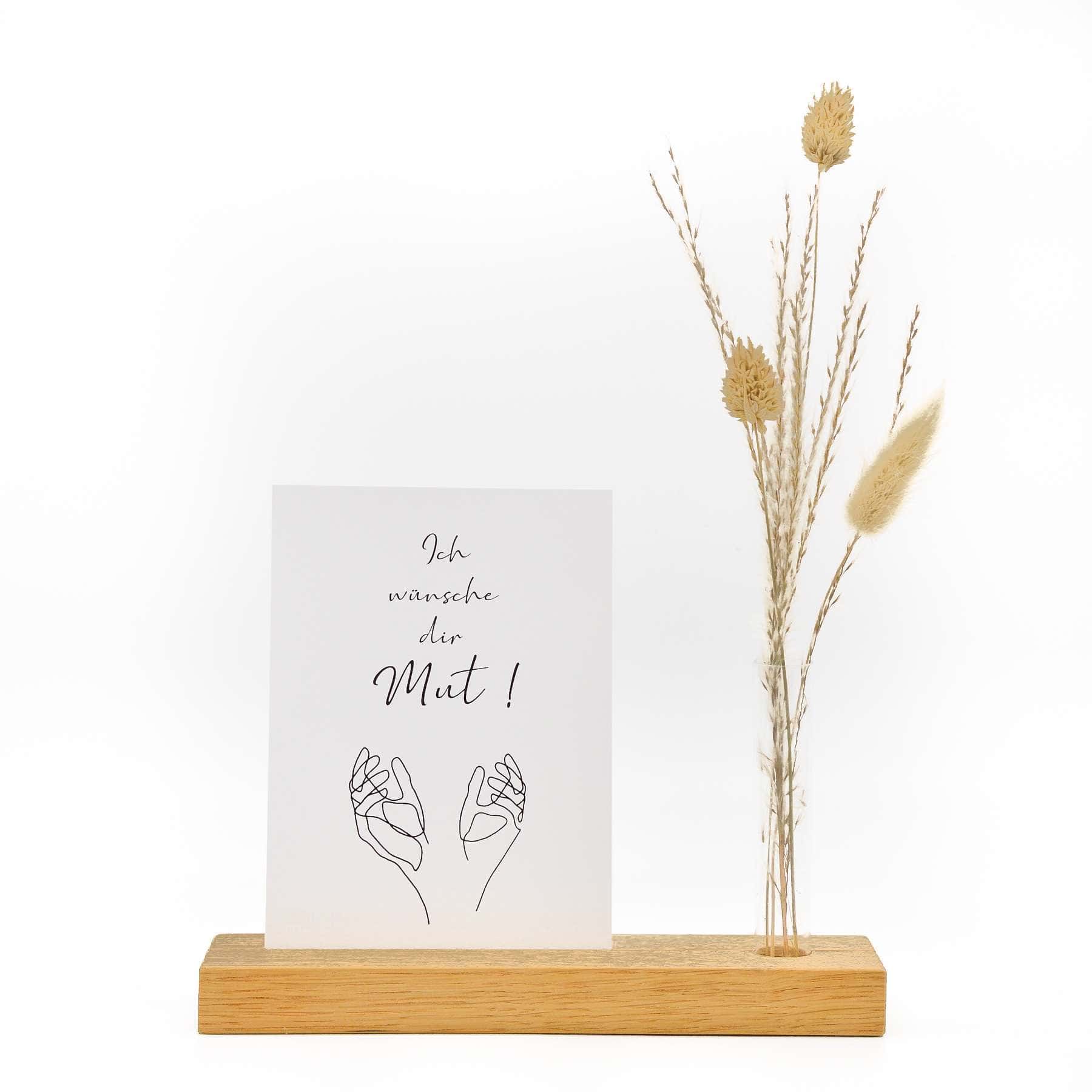 Einen Holzständer mit Reagenzglas und eine Karte im Postkartenformat. Die Dekoration ist nicht mit inbegriffen.