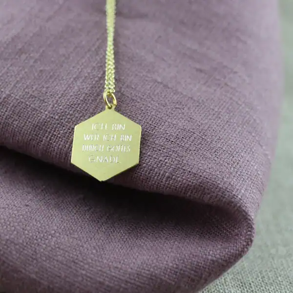 Auf dem Anhänger in Sechskantform ist das Wort GNADENZEIT graviert. Auf der Rückseite die Worte aus 1. Korinther 10 Vers 15: Ich bin wer ich bin durch Gottes Gnade.