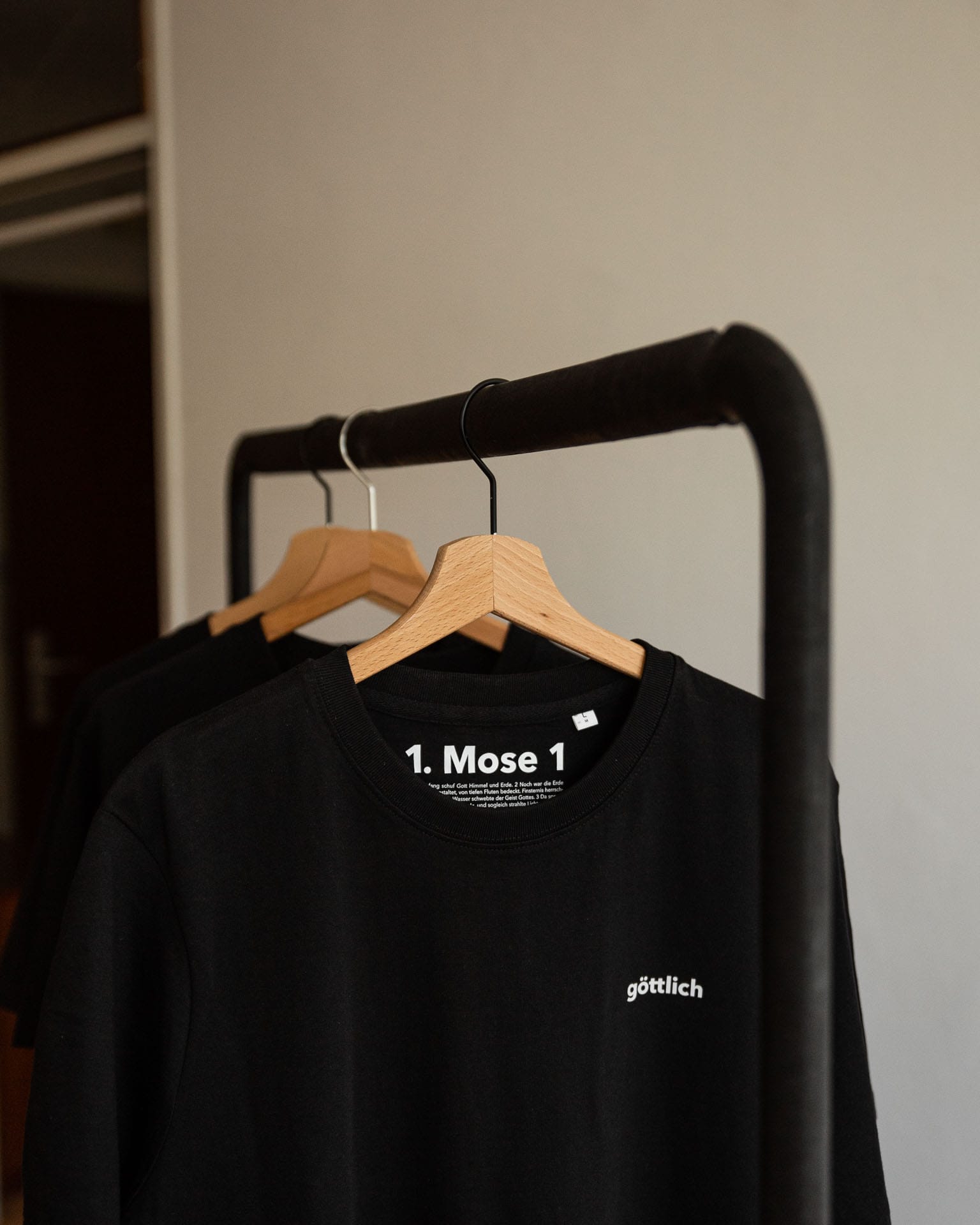 1. mose 1 ist auf der innenseite wortgetreu abgedruckt. das motiv «göttlich» ist von dem folgenden bibelvers inspiriert: so schuf gott den menschen als sein abbild, ja, als gottes ebenbild; und er schuf sie als mann und frau. / 1. mose 1.27