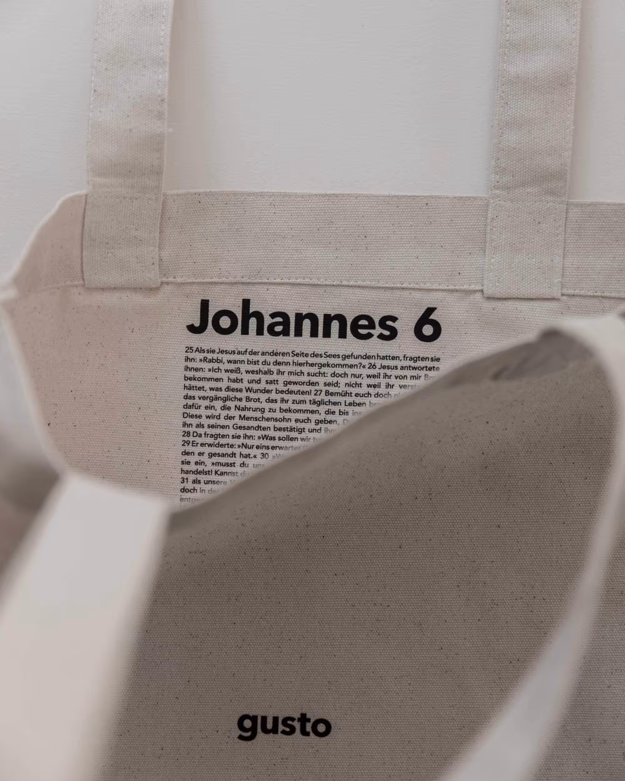 johannes 6 ist auf der innenseite wortgetreu abgedruckt. das motiv «gusto» ist von dem folgenden bibelvers inspiriert: ich bin das brot des lebens« sagte jesus zu ihnen. »wer zu mir kommt, wird niemals wieder hungrig sein, und wer an mich glaubt, wird nie wieder durst haben. / johannes 6.35