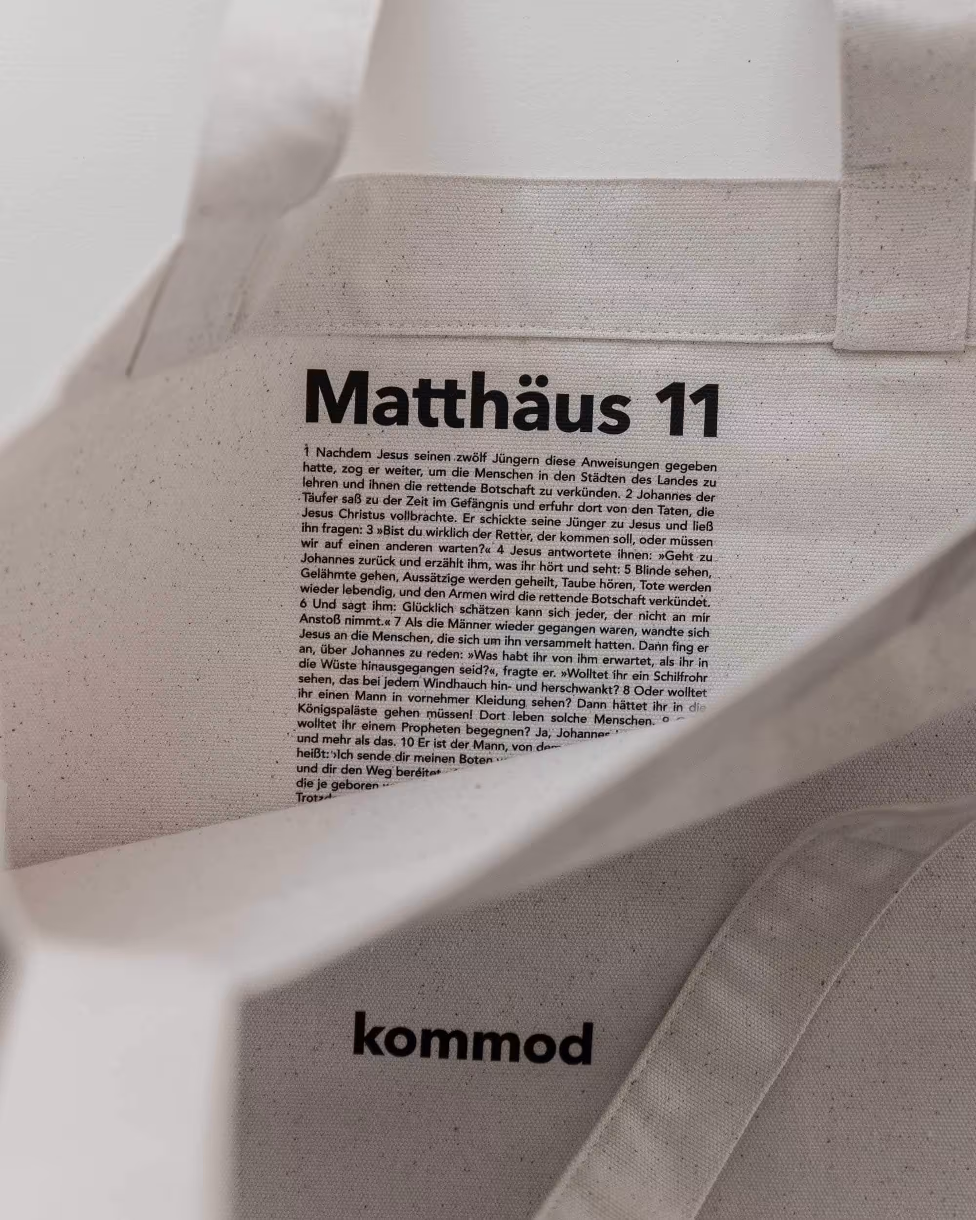 matthäus 11 ist auf der innenseite wortgetreu abgedruckt. das motiv «kommod» ist von dem folgenden bibelvers inspiriert: kommt alle her zu mir, die ihr euch abmüht und unter eurer last leidet! Ich werde euch ruhe geben. vertraut euch meiner leitung an und lernt von mir, denn ich gehe behutsam mit euch um und sehe auf niemanden herab. wenn ihr das tut, dann findet ihr ruhe für euer leben. das joch, das ich euch auflege, ist leicht, und was ich von euch verlange, ist nicht schwer zu erfüllen. / matthäus 11.28-30