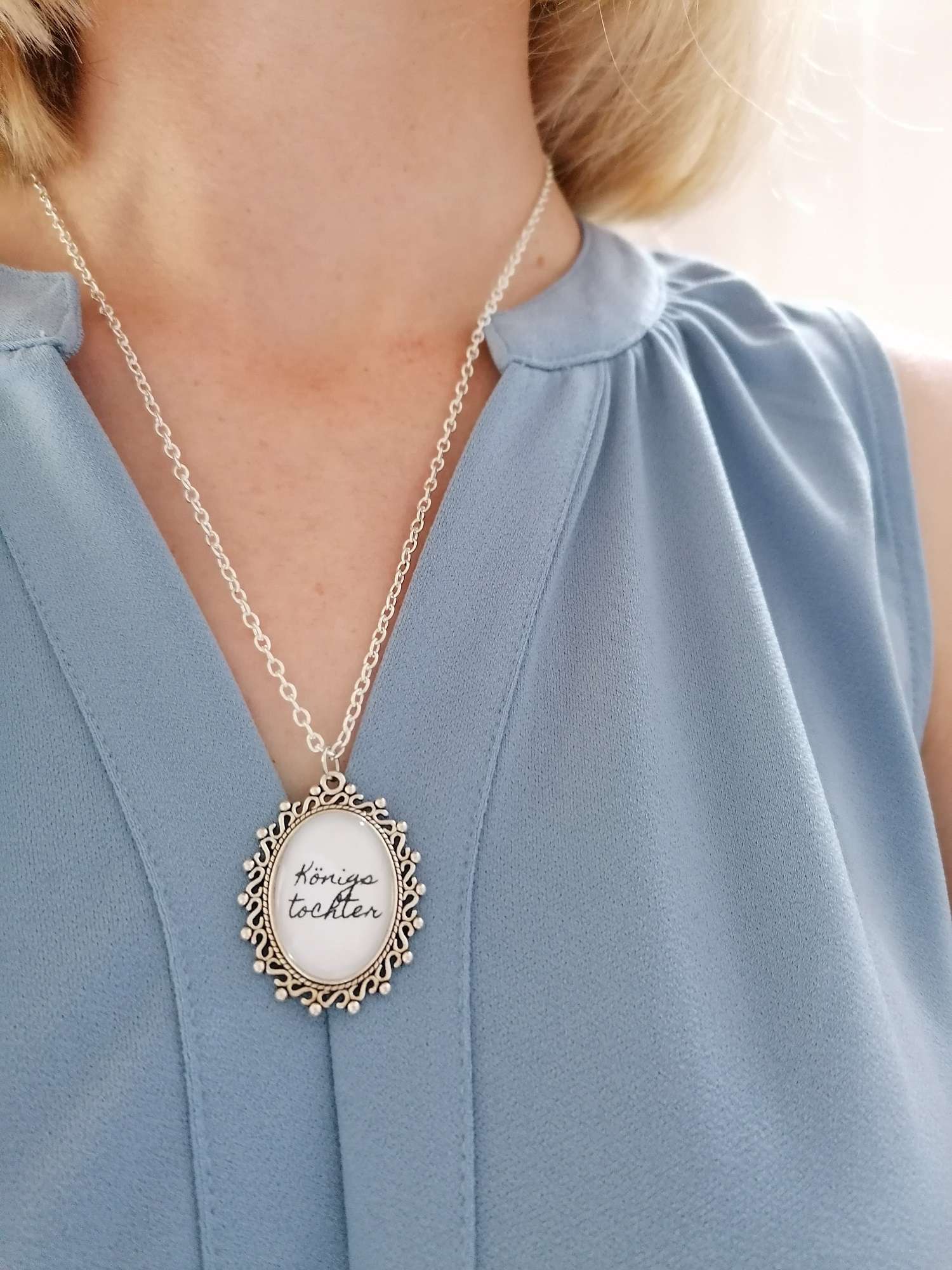 Du kaufst eine wunderschöne Kette in silber mit dem ermutigenden Wort “Königstochter”.