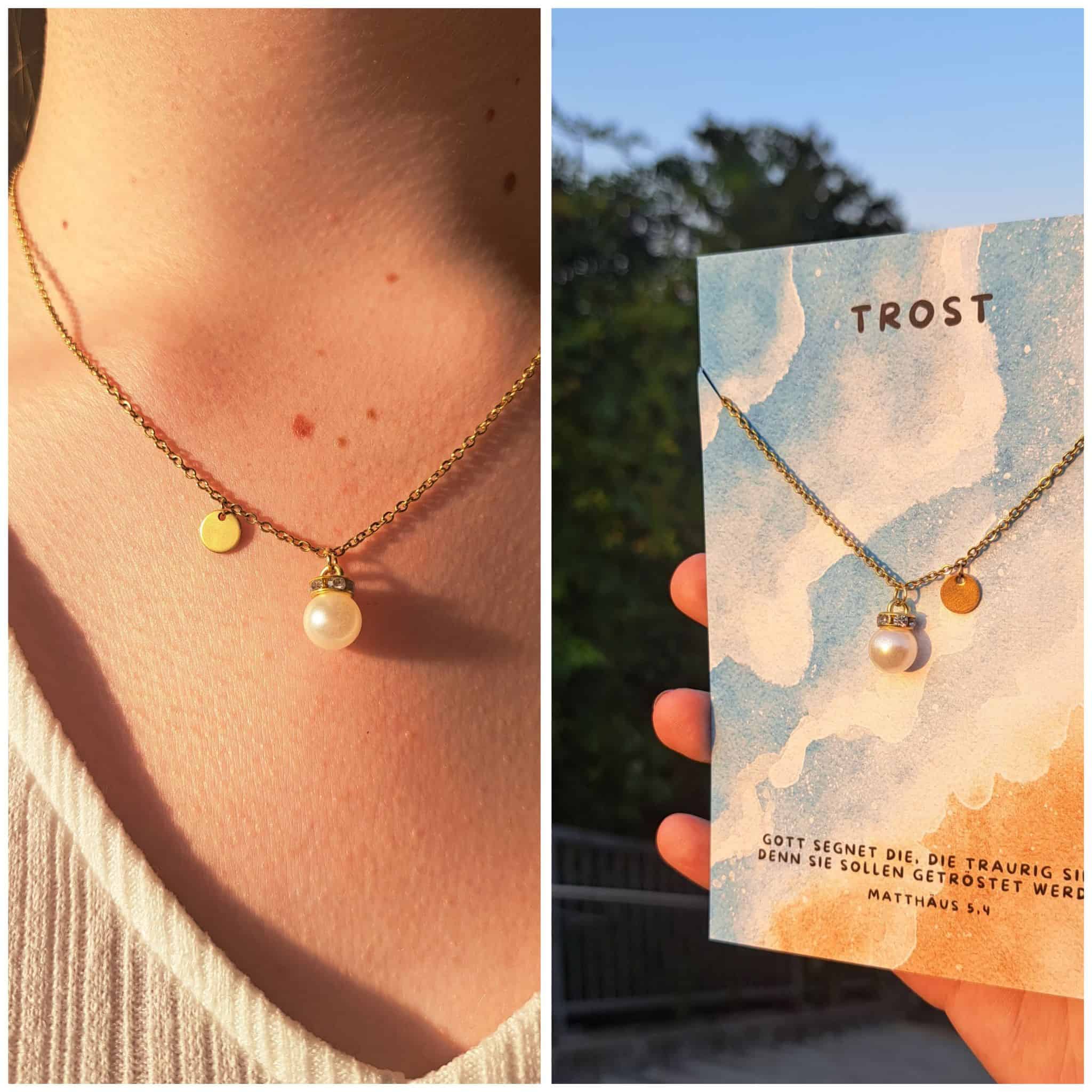 Die Kette “Trost” ist eine wunderschöne, sehr zarte Kette in Gold mit einem Perlenanhänger und einem kleinen Goldplättchen. Sie kommt mit einer wunderschön gestalteten Karte zum Thema Trost.