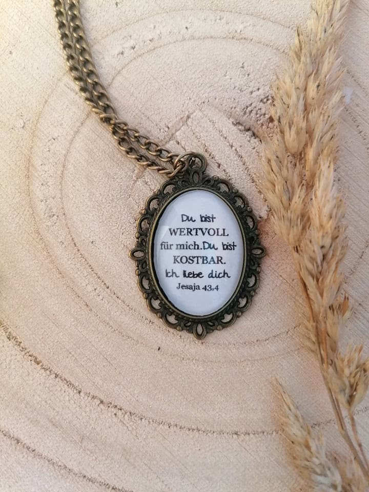 Du kaufst eine wunderschöne Vintagekette in bronze mit dem ermutigenden Bibelvers “Du bist kostbar und wertvoll für mich. Ich liebe dich.” aus Jesaja 43,4. Was für eine Zusage!