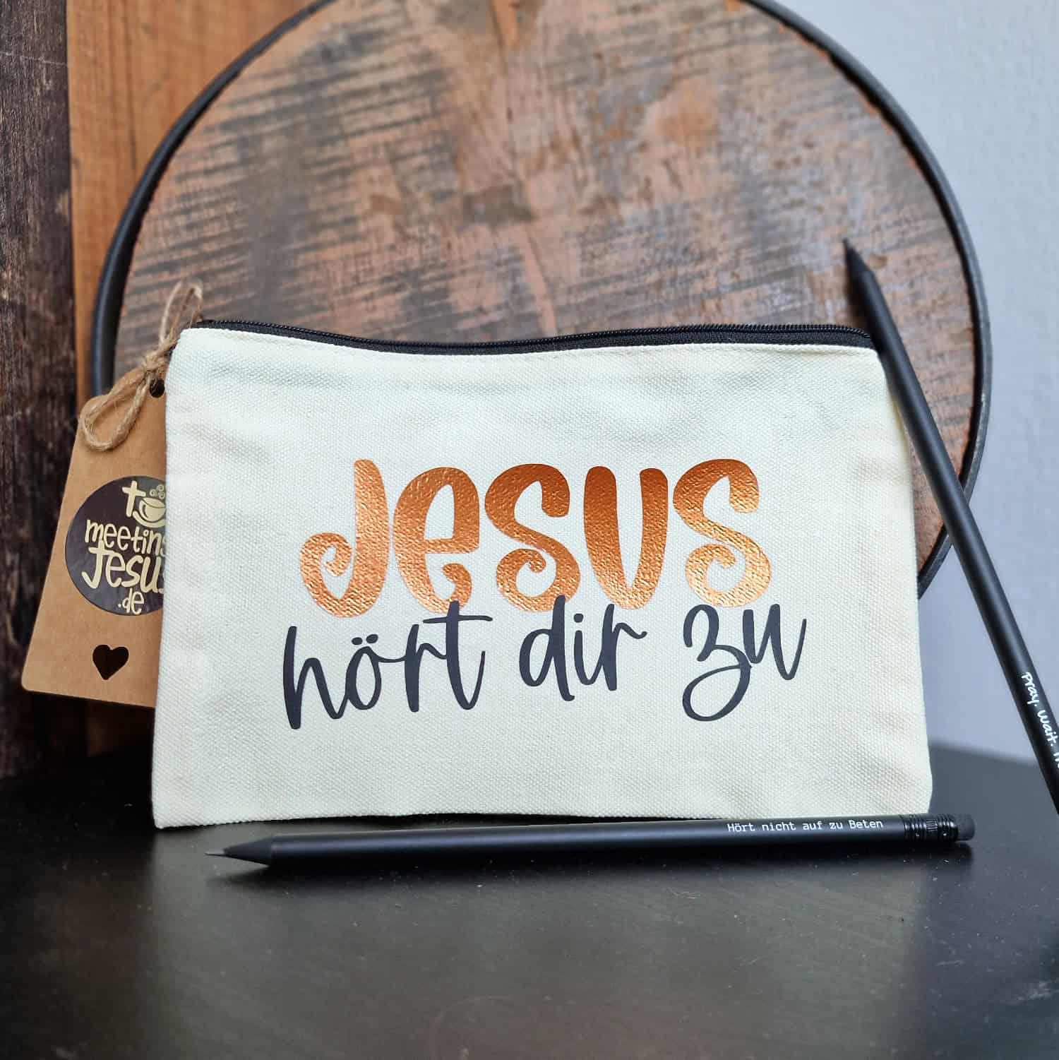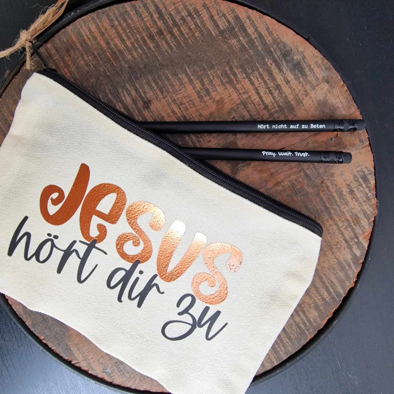 Erweitere deinen persönlichen Stil und zeige deine Verbundenheit zu Jesus mit unserer Federmappe ‘Jesus hört dir zu’. Handgefertigt und voller Liebe gemacht, ist sie das perfekte Accessoire für dich oder ein tolles Geschenk für deine Lieben. Vertraue darauf, dass Jesus immer an deiner Seite ist und lass dich von seiner bedingungslosen Liebe begleiten.