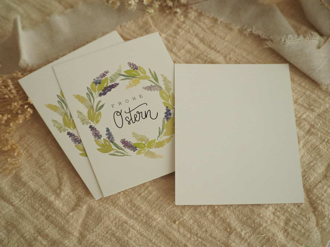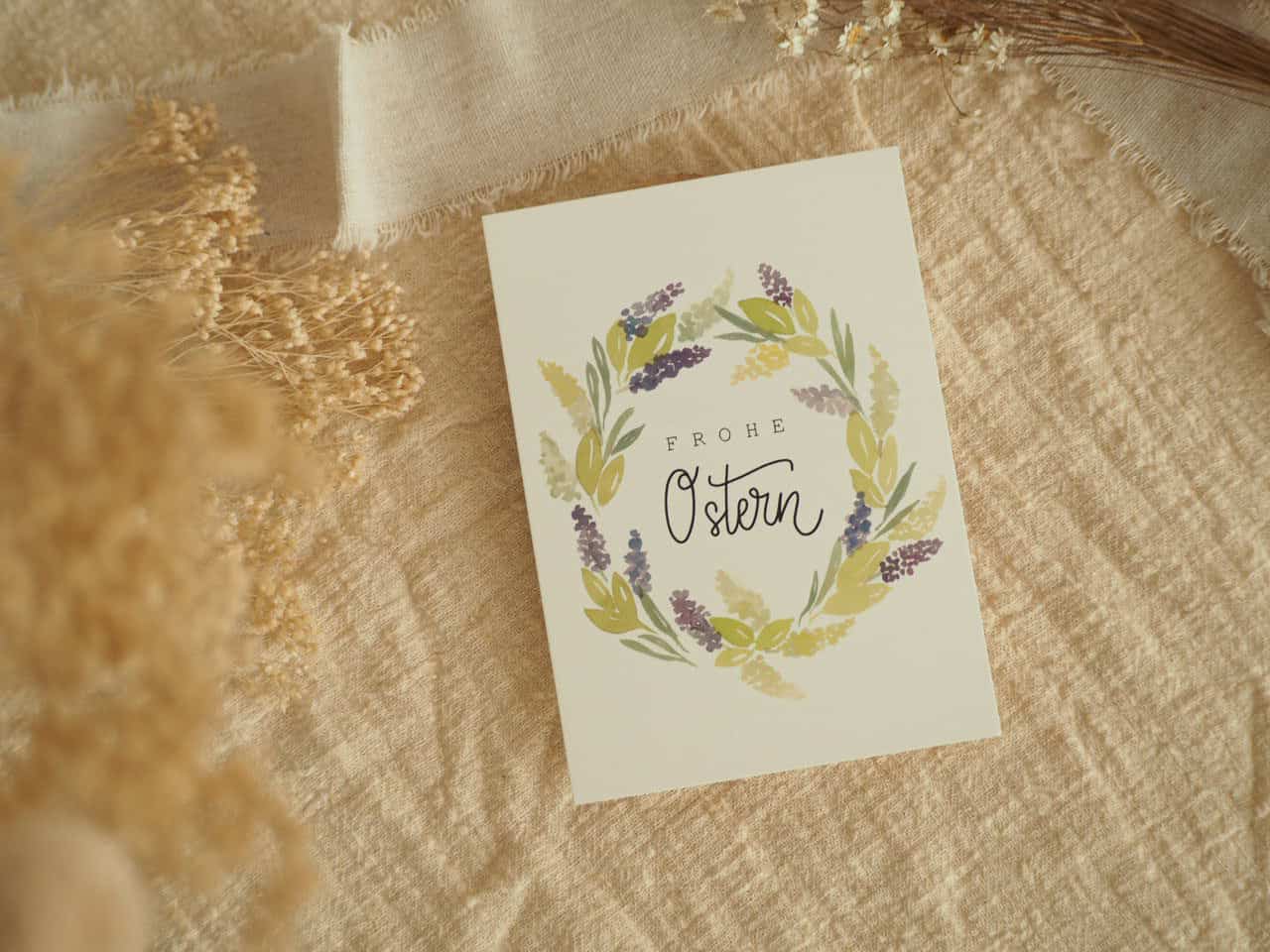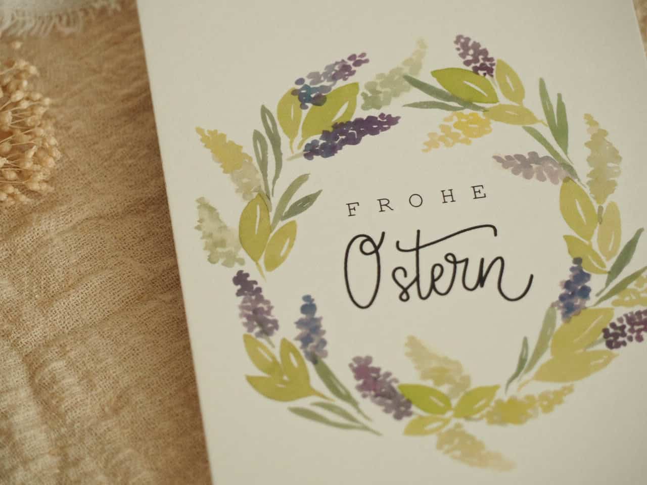 Der Osterkranz ist mit Aquarellfarben gemalt, digitalisiert und in Farbe gedruckt.