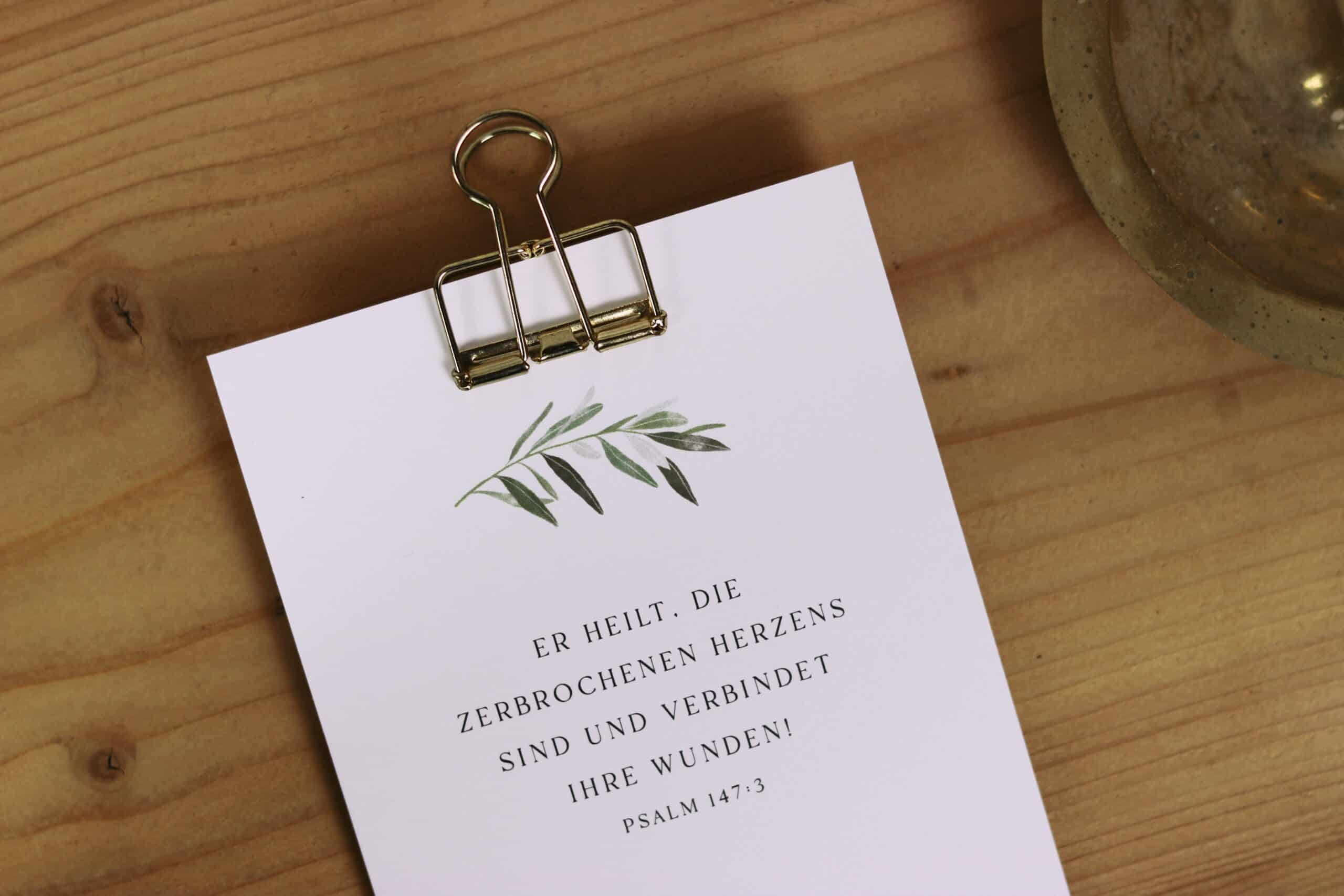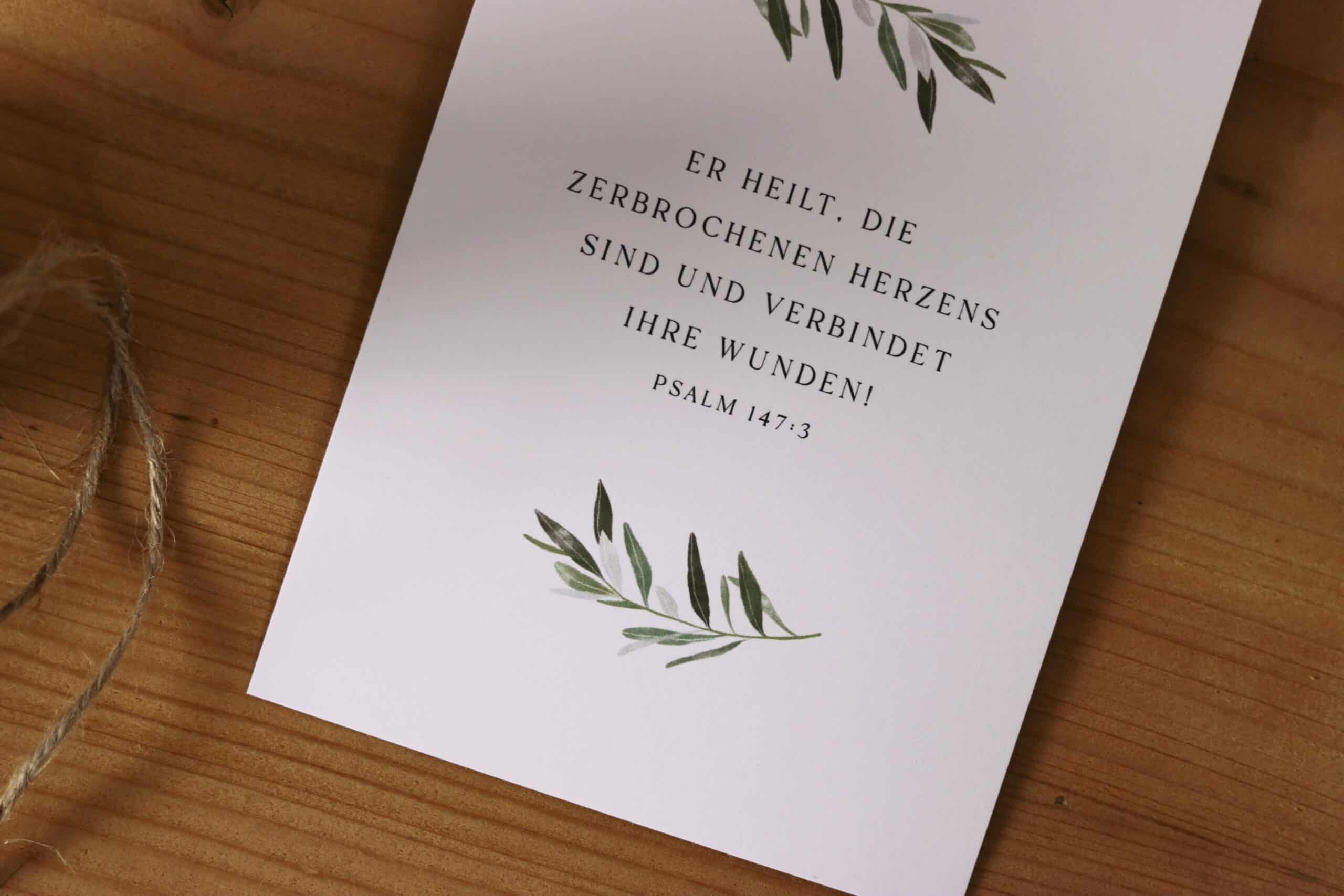 - Trauerkarte – “Er heilt die zerbrochenen Herzens sind und verbindet ihre Wunden.” (Psalm 147:3)