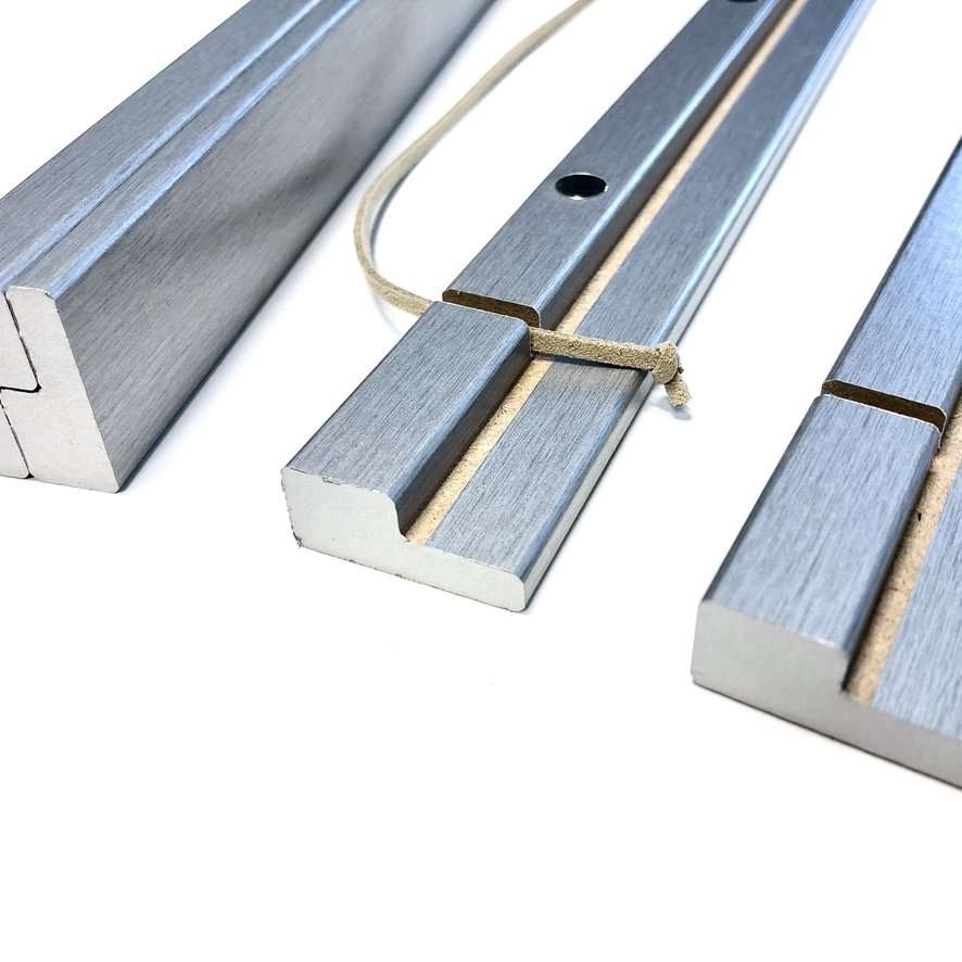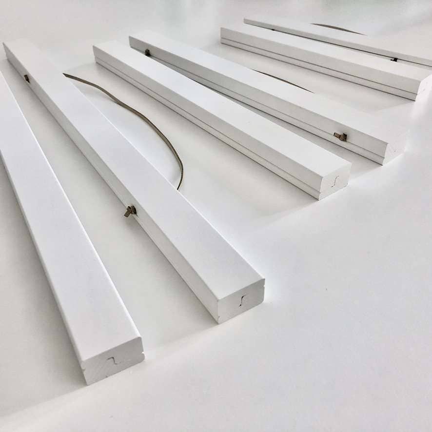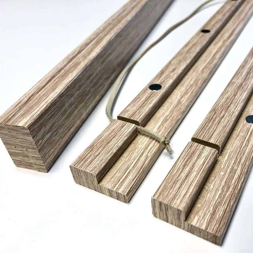 – 1 Bilderhalter besteht aus 2 oberen Leisten mit Nut und 2 unteren Leisten ohne Nut und einer Aufhängeschnur.