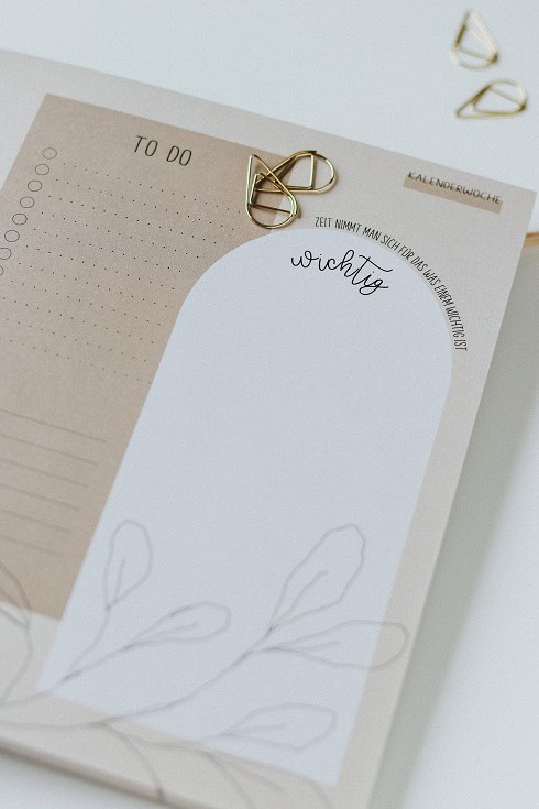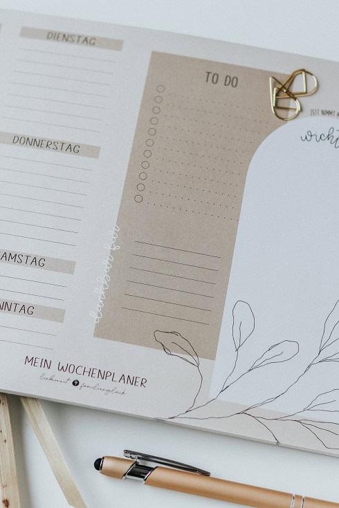 Der Wochenplaner ist (d)ein perfekter Alltagsbegleiter, um deine Woche und deinen Tag effektiv zu organisieren. Damit du alles auf einen Blick hast, gibt es hier auch extra Platz für deine To Do’s und wichtige Dinge, die du nicht vergessen darfst. Damit du vor lauter Terminen und Aufgaben nicht unzufrieden wirst, kannst du in der Rubrik „dankbar für“ Dinge aufschreiben, die dich dankbar und glücklich machen.