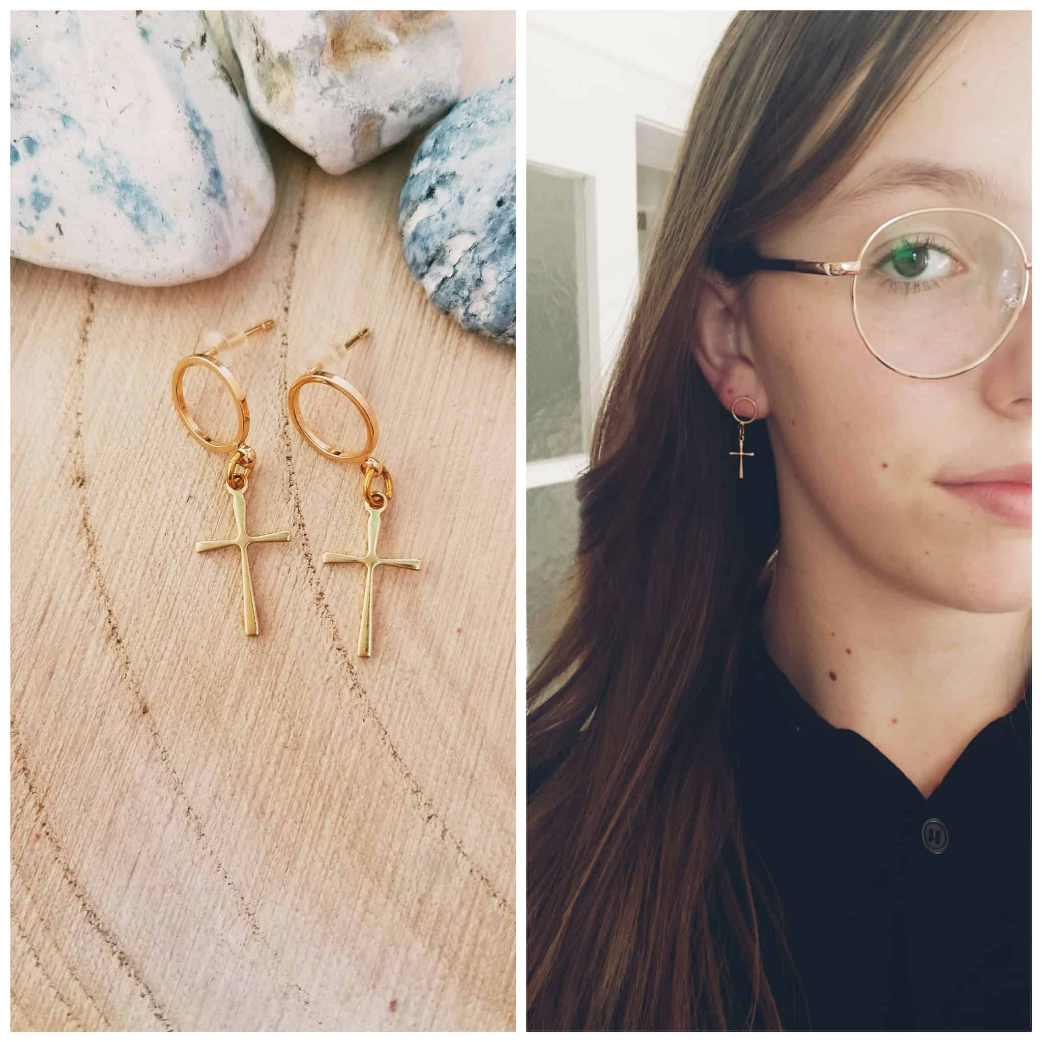 Du kaufst ein wunderschönes Ohrringpaar mit zarten Goldkreuzen an einem Goldkreisstecker.
