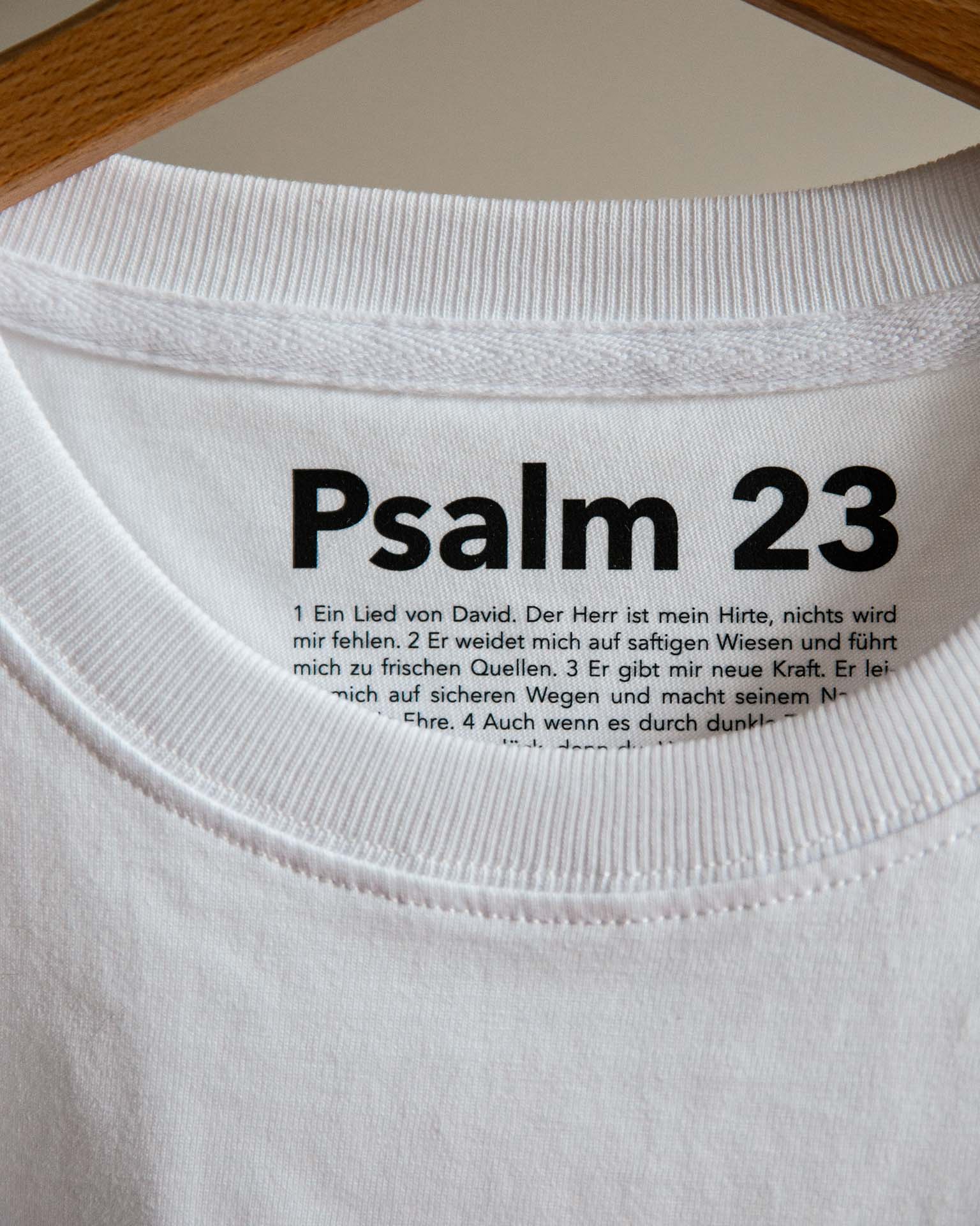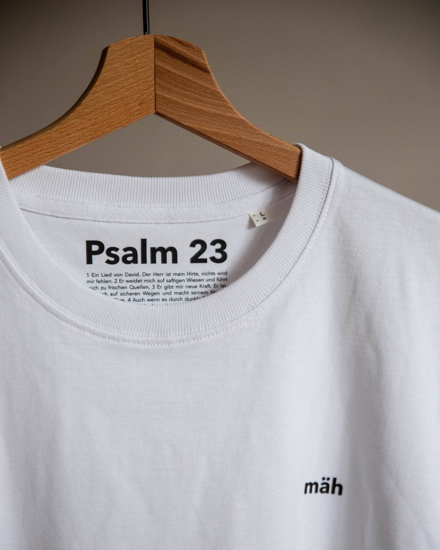 psalm 23 ist auf der innenseite wortgetreu abgedruckt. das motiv «mäh» ist von dem folgenden bibelvers inspiriert: der herr ist mein hirte, mir wird nichts mangeln. er weidet mich auf saftigen wiesen und führt mich zu frischen quellen. / psalm 23.1-2
