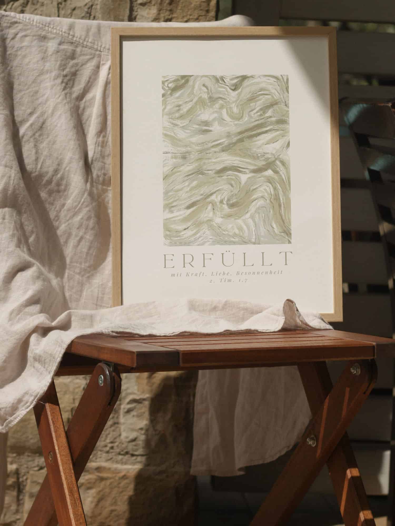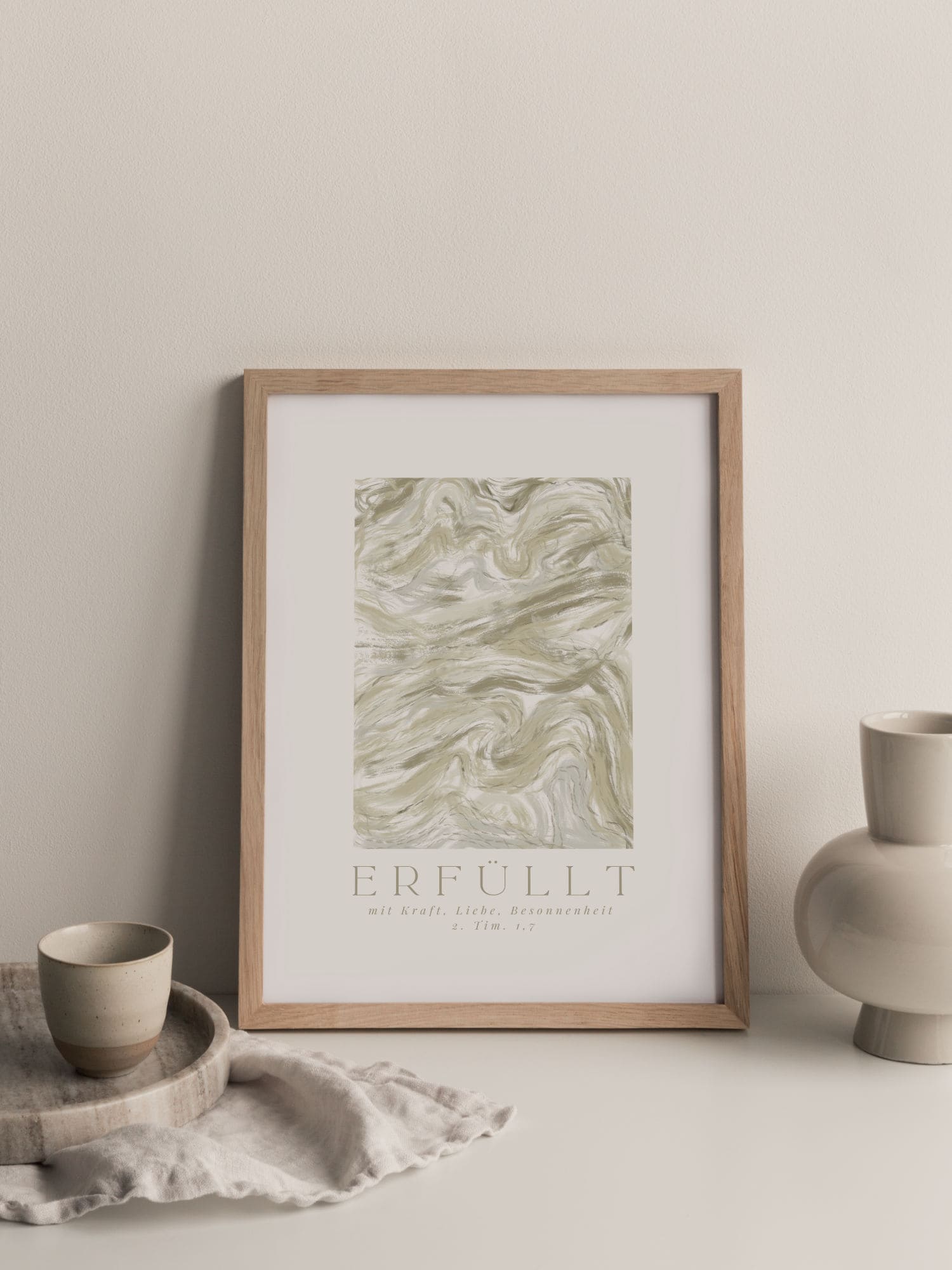 Christliches Poster „Erfüllt“ in Beige & Creme – moderner Kunstdruck mit Bibelvers 2. Timotheus 1,7, ästhetisch-minimalistisch und perfekt als Geschenk.