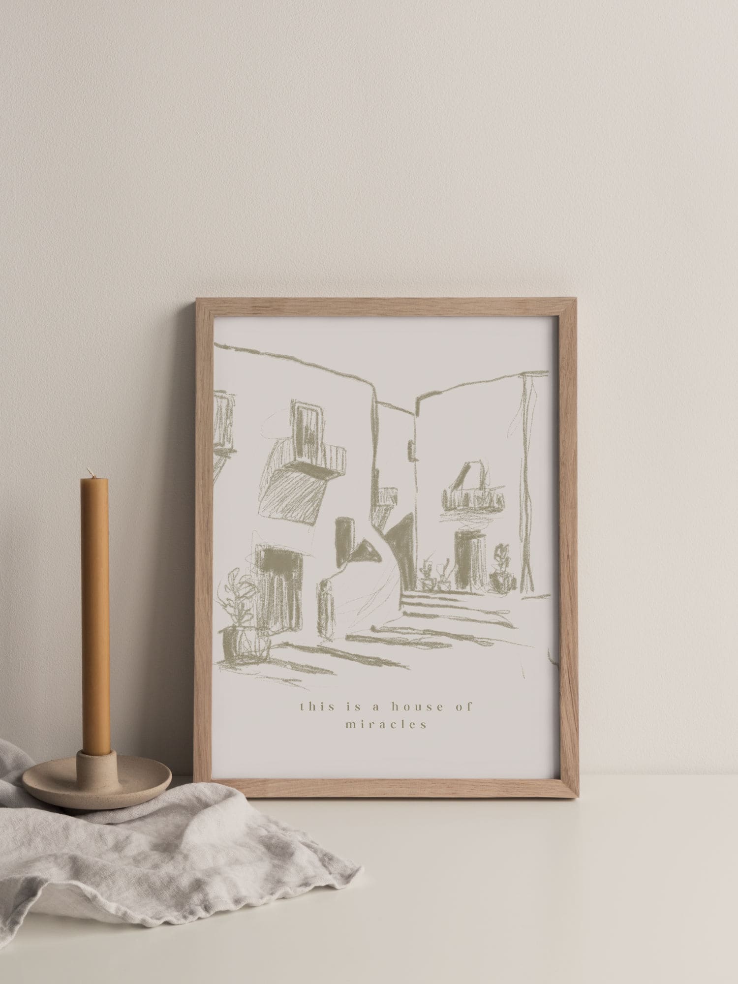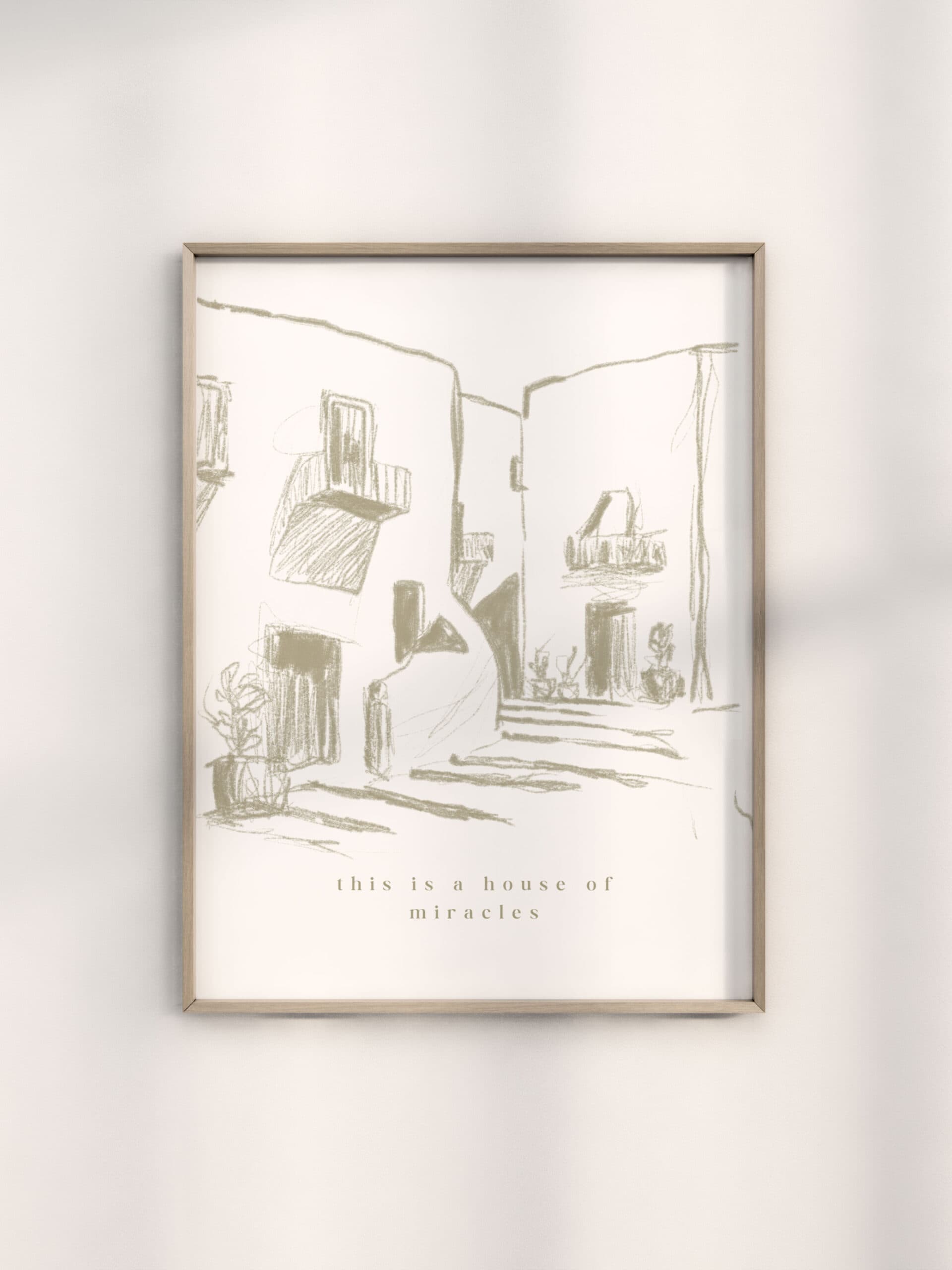 Ästhetisches christliches Poster “This is a house of miracles” in Beige und Creme – minimalistische Wanddeko, ideal als Geschenk zum Einzug oder fürs Wohnzimmer.