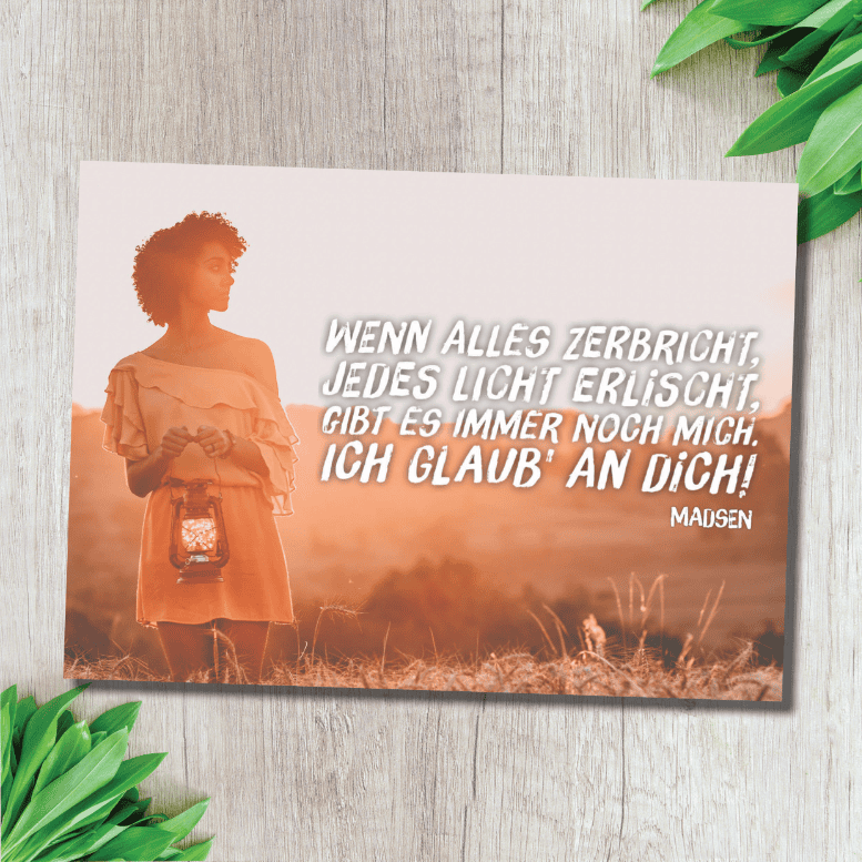 Text: Wenn alles zerbricht, jedes Licht erlischt, gibt es immer noch mich. Ich glaub an Dich. (Madsen)