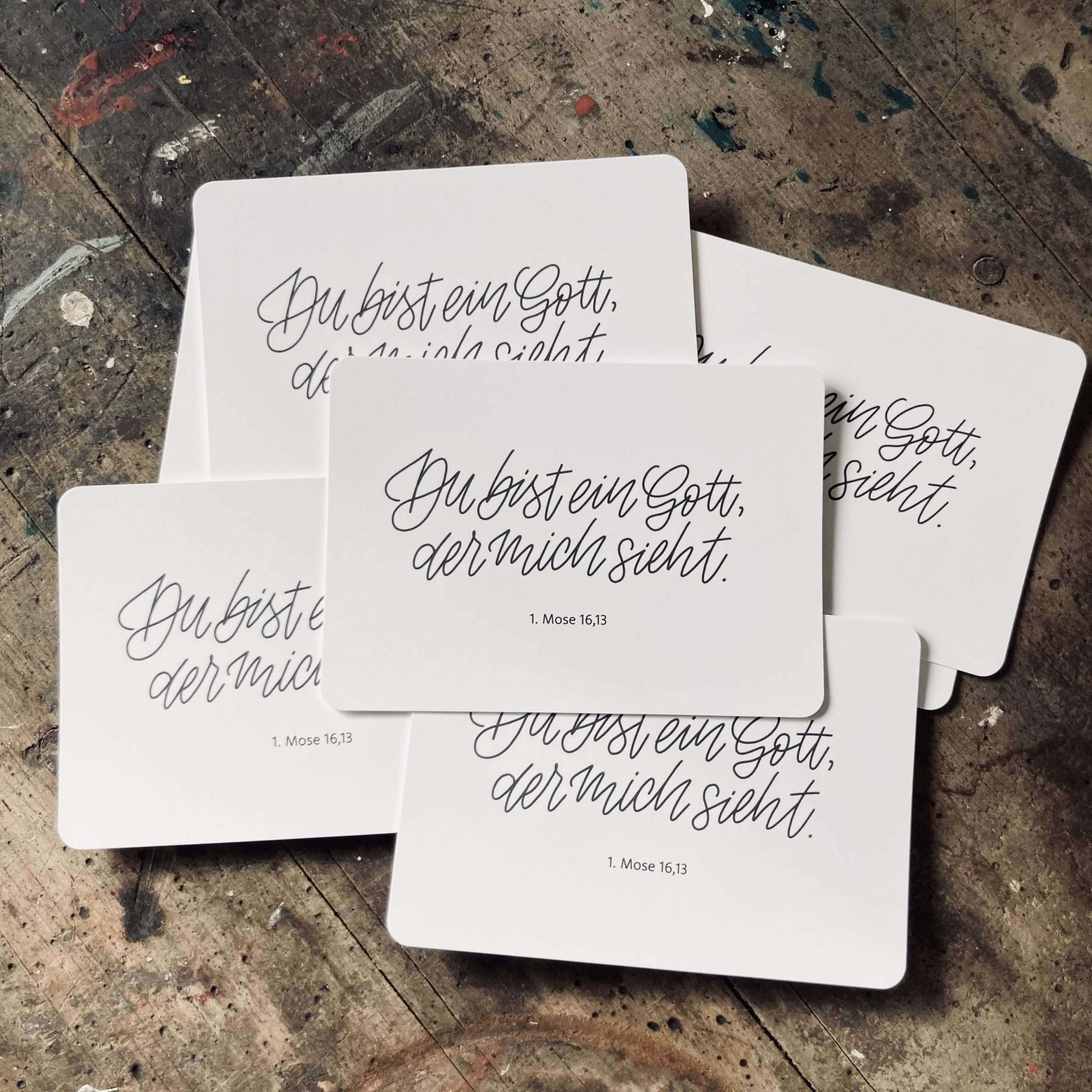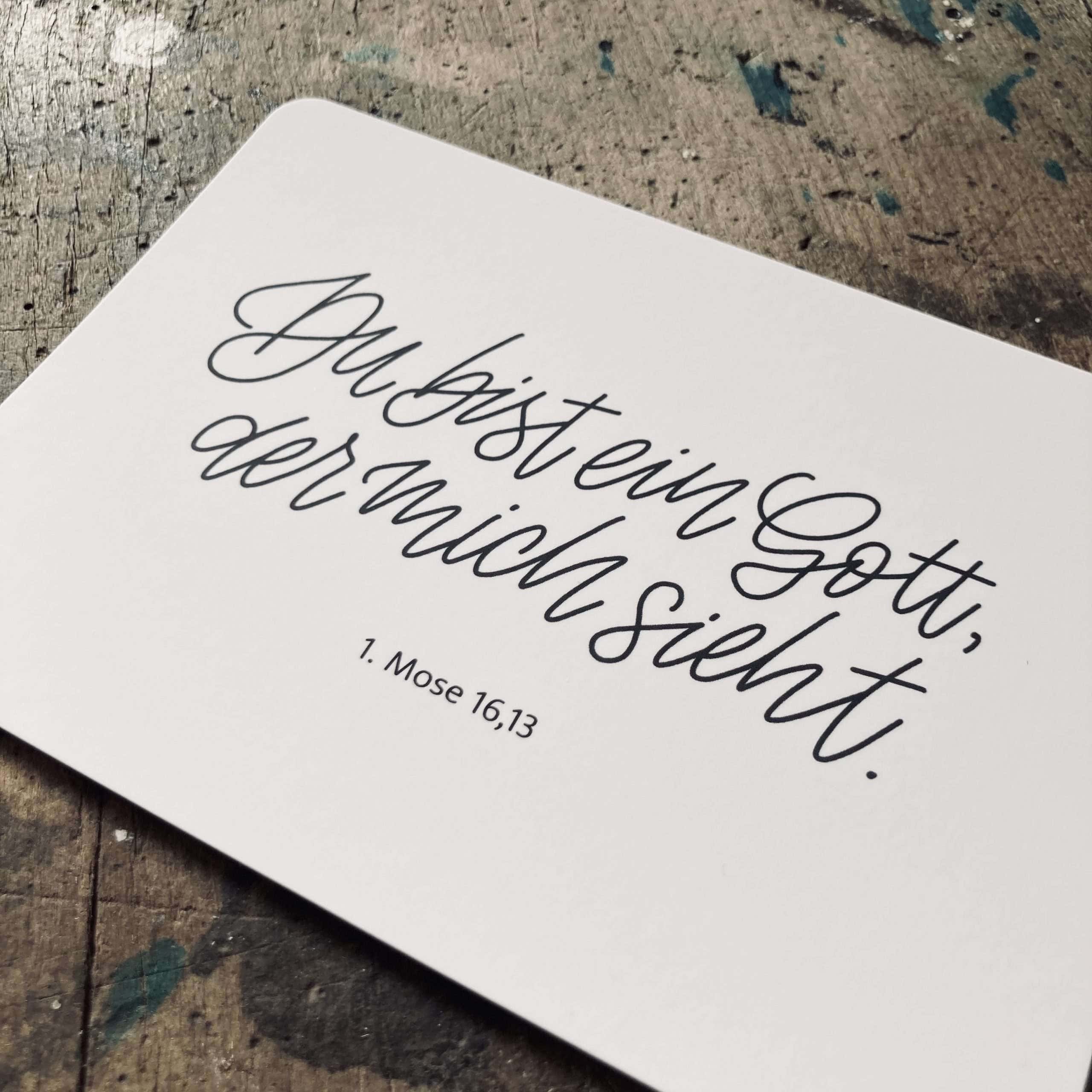 Hochwertige Postkarte mit Lettering-Print “Du bist ein Gott, der mich sieht”. Die Karte ist auf der Rückseite beschreibbar. Die Vorderseite ist mit einer matten Soft Touch Cellophanierung veredelt und liefert somit eine besondere Haptik.