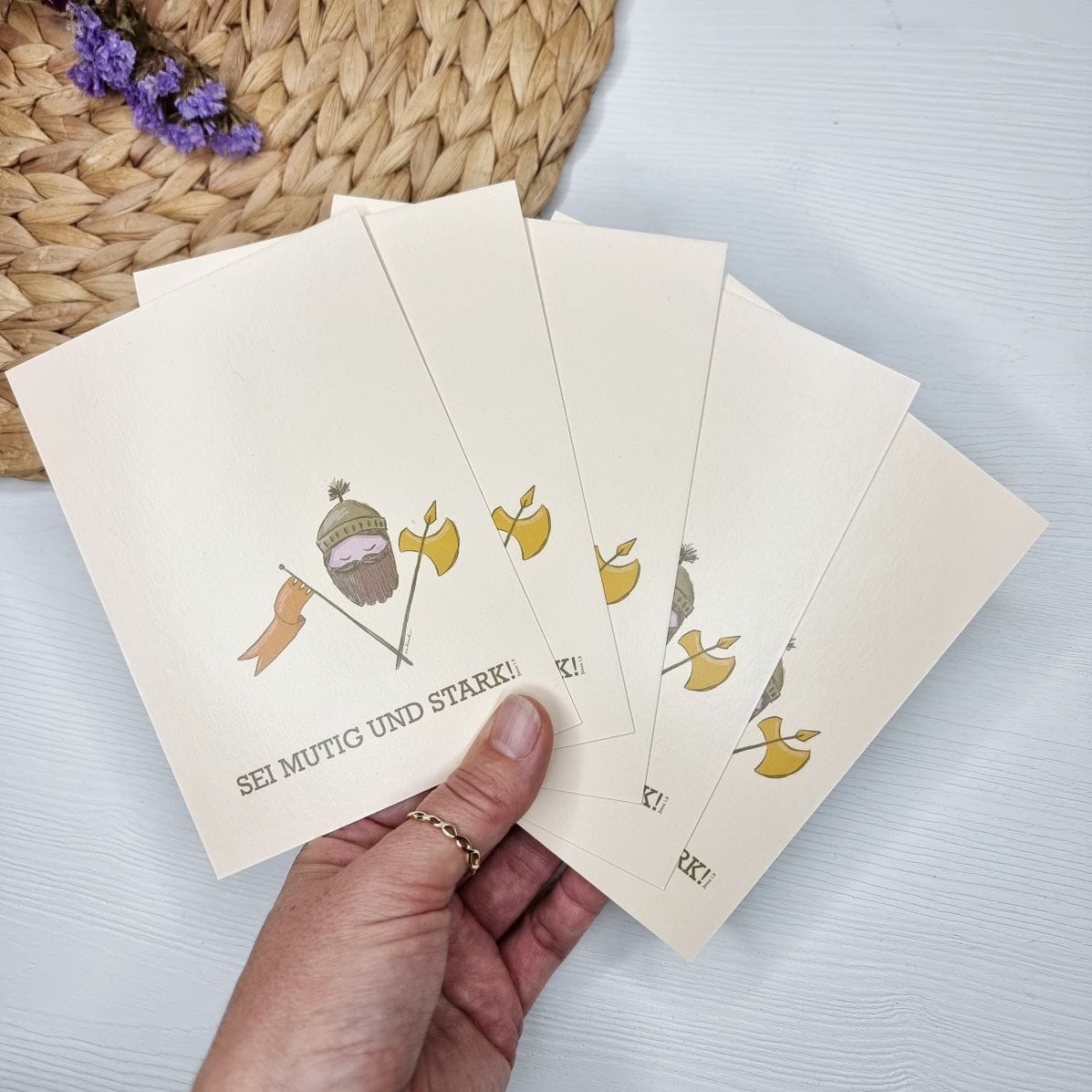 Set aus 5 Postkarten mit dem Bibelvers „Sei mutig und stark! Fürchte dich nicht, denn der Herr dein Gott ist bei dir.“ (Josua 1, 9)