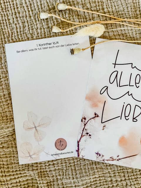Alles was ihr tut soll aus Liebe geschehen! Dieser Vers aus 1. Korinther 16,14 wird uns das kommende Jahr begleiten als Jahreslosung. Ich habe Euch eine abwechslungsreiche Serie gestaltet von 4 Postkarten. Sie sind auf hochwertigen 400 g Offset Naturkarton gedruckt und die Rückseite ist mit dem Bibelvers versehen und hat jede Menge Platz zum beschreiben. Dieses Kartenset ist super geeignet zum Verschenken oder im Kartenhalter ein echter Hingucker.