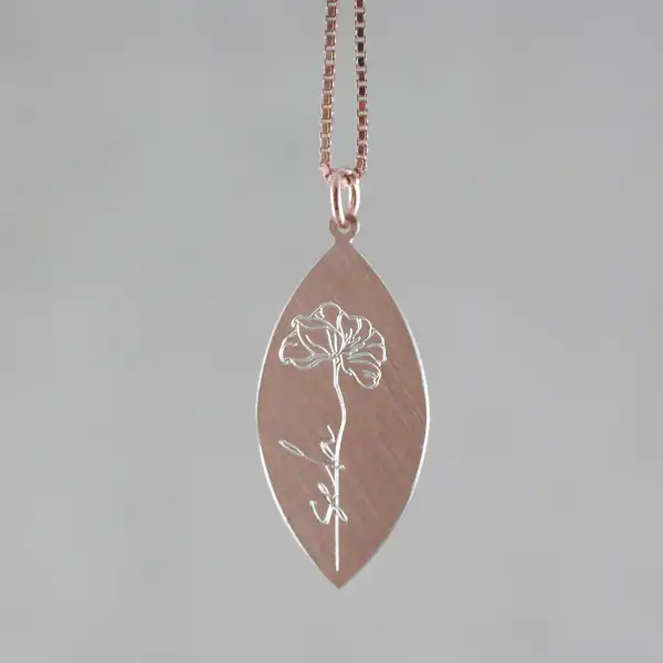 Auf dem navetteförmigen Anhänger ist das Wort SELA graviert, das an einer Blume ruht.