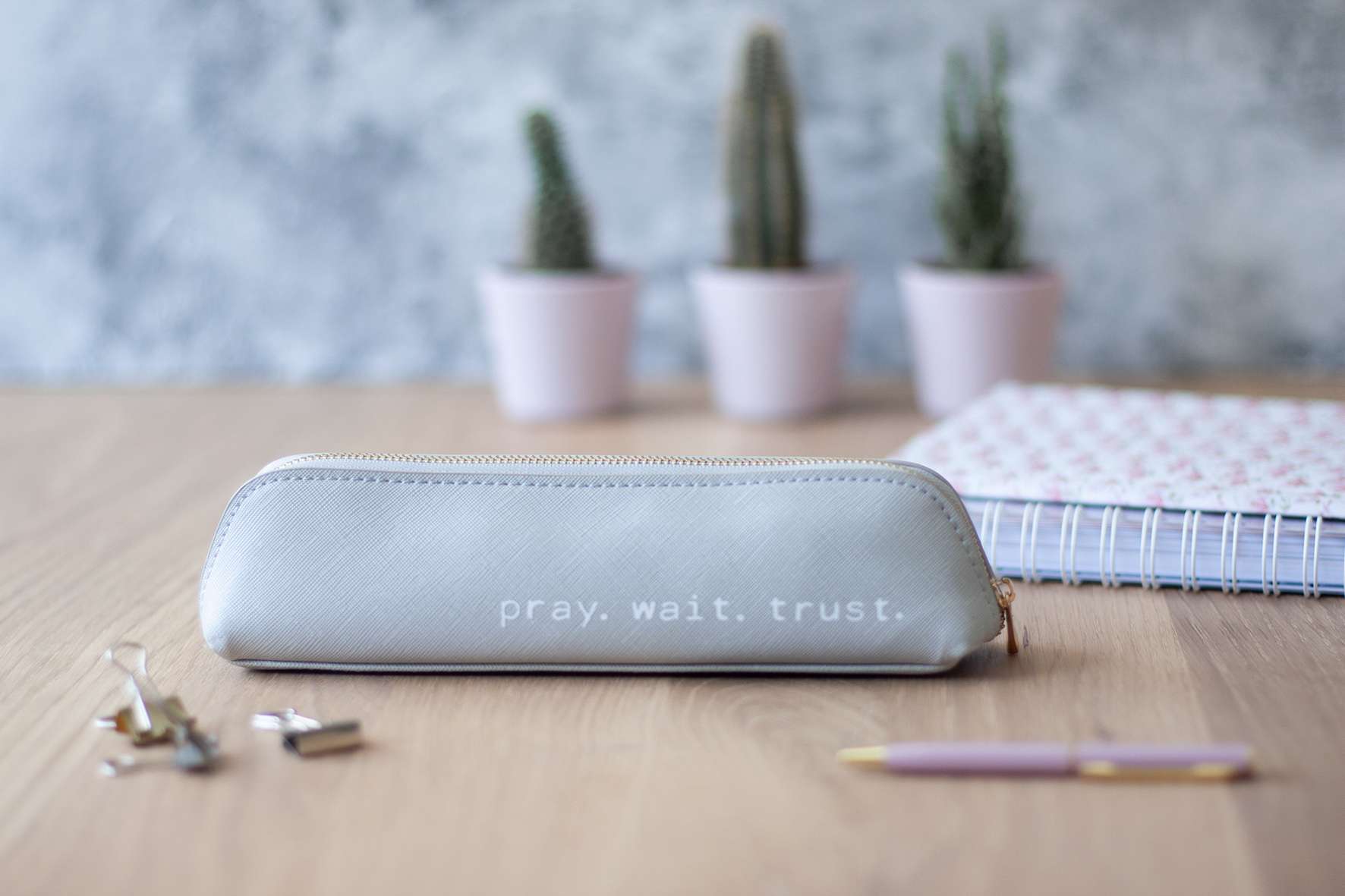 Schönes, kleines Federmäppchen oder Kosmetiktasche mit ermutigendem Spruch “pray. wait. trust.”