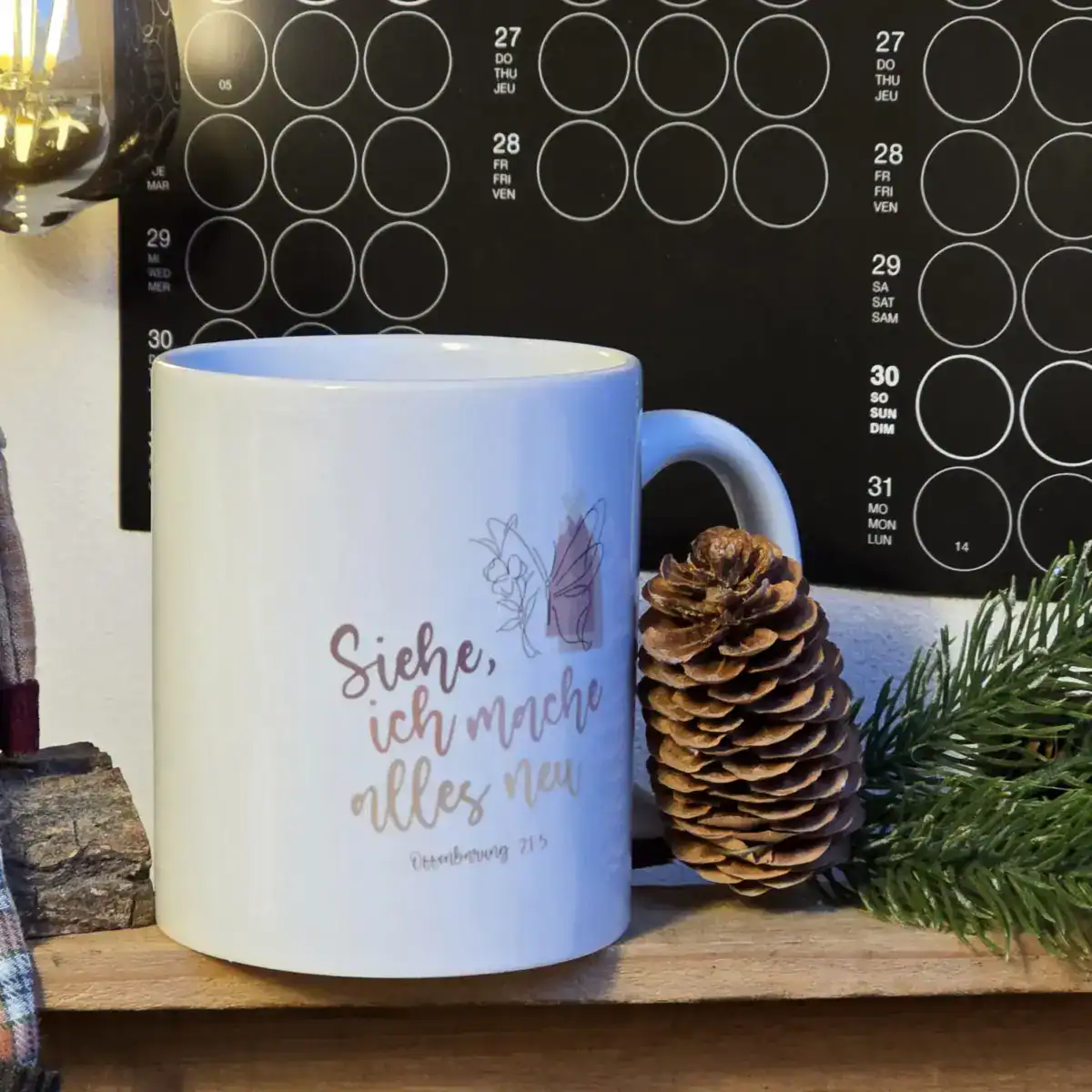 Gottes Verheißung „Siehe, ich mache alles neu“ (Offenbarung 21,5) begleitet dich mit dieser Tasse durch jeden Morgen – ob beim ersten Kaffee, beim Tee mit einer Freundin oder in einer stillen Andacht. Wir haben das Design mit viel Liebe in Handarbeit veredelt, damit der Vers nicht nur auf dem Papier, sondern auch in deinem Alltag lebendig wird. Die spülmaschinenfeste Oberfläche hält der täglichen Nutzung stand. Gott schenkt dir jeden Tag die Chance für Veränderung und Hoffnung.