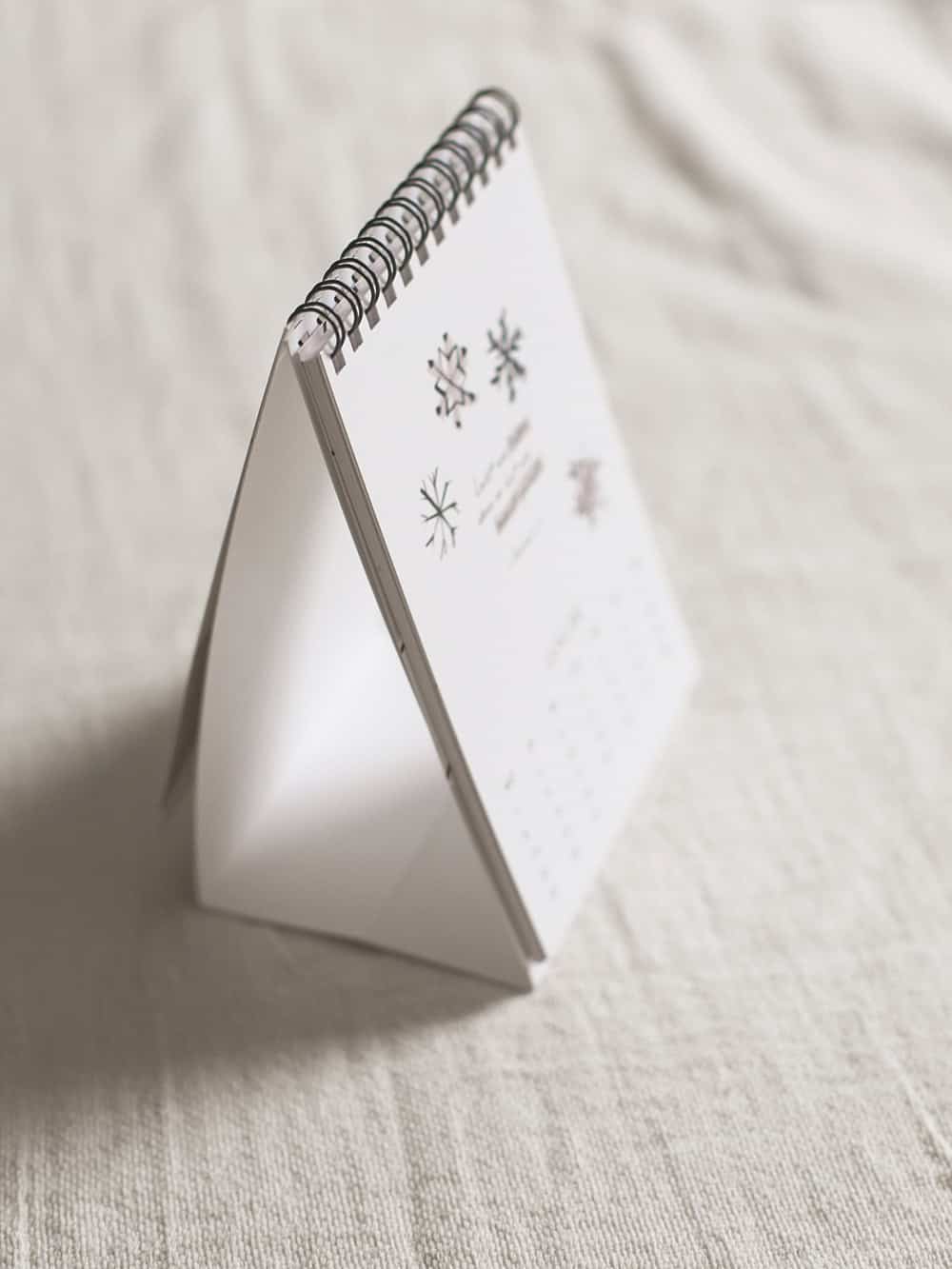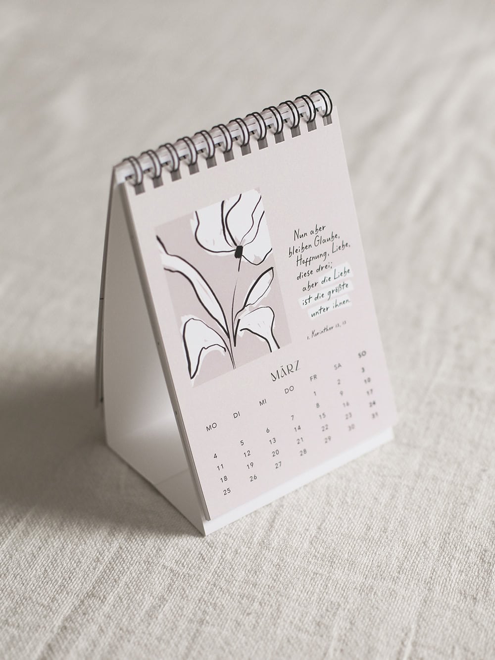 Der beliebte Tischkalender hat dieses Jahr ein Upgrade bekommen: Eine hochwertige Ringbindung und einen Standfuß, so dass man ihn leichter aufstellen und umblättern kann.