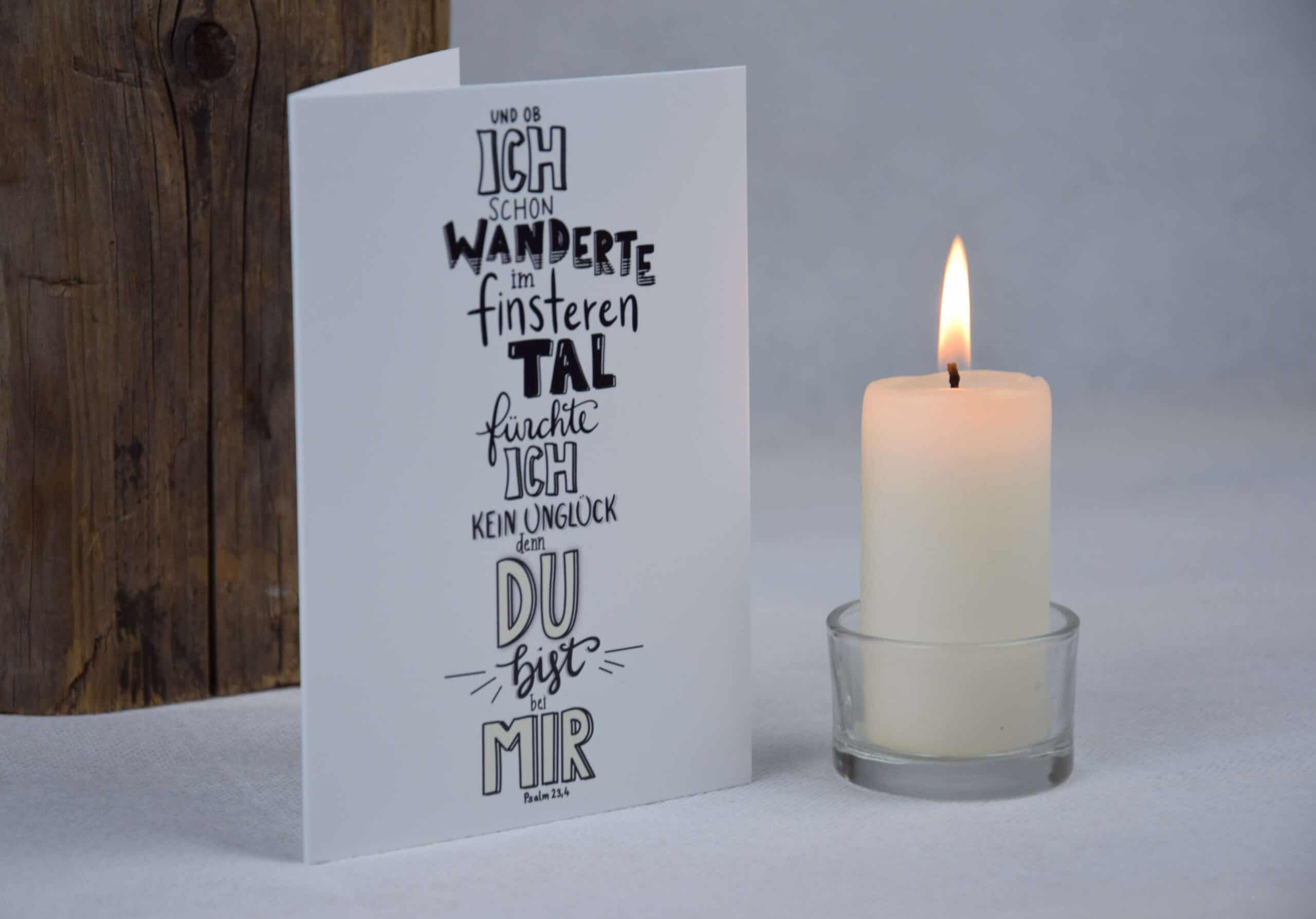 Trauer und dennoch Trost. Die Beileidskarte “Finstere Tal” soll Trost und Hoffnung geben in der schwierigen Phase, wenn ein geliebter Mensch von uns geht. Der Text auf der Karte steht in Psalm 23,4.