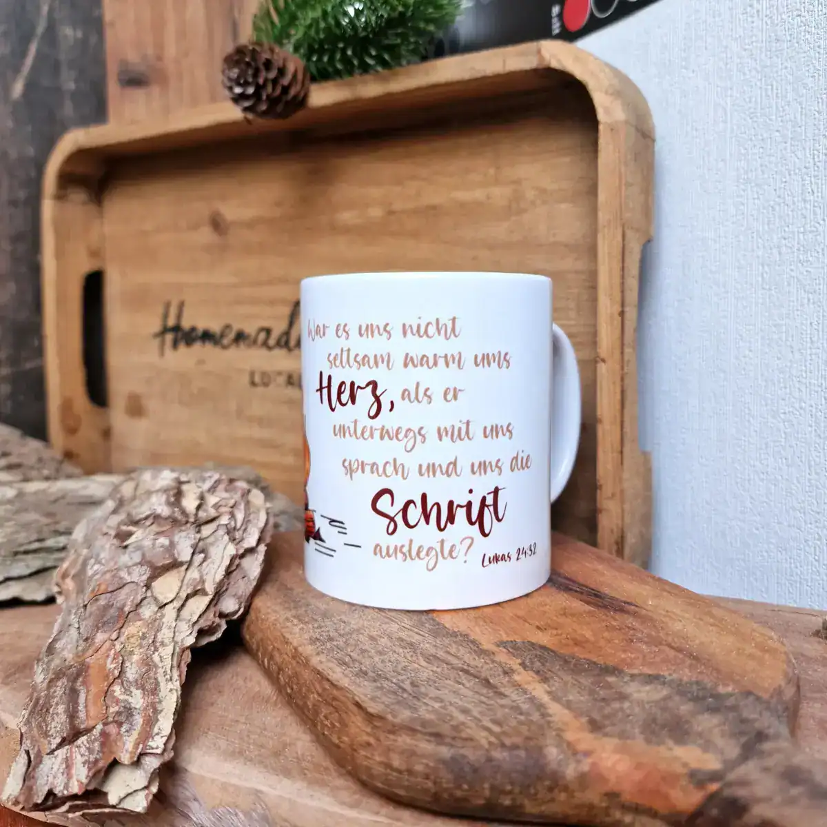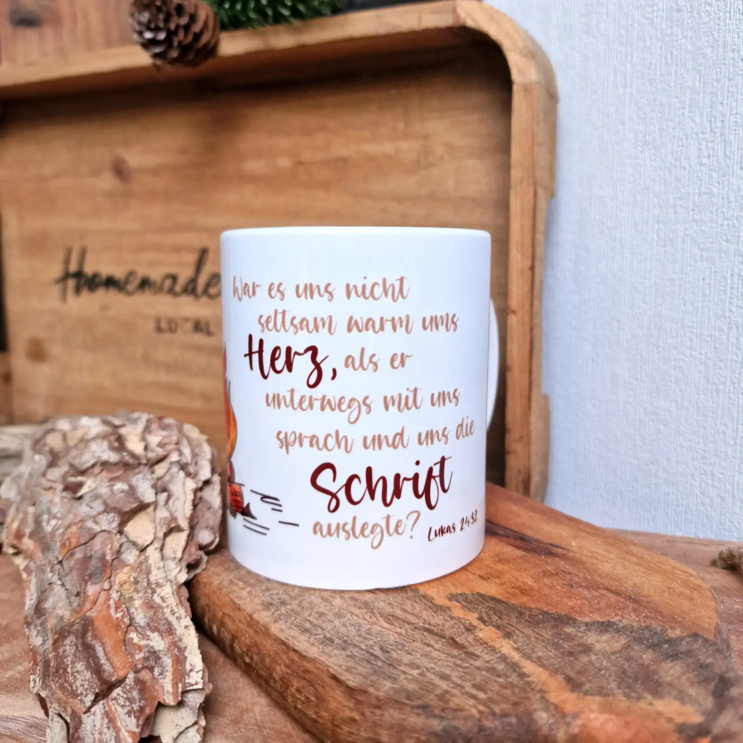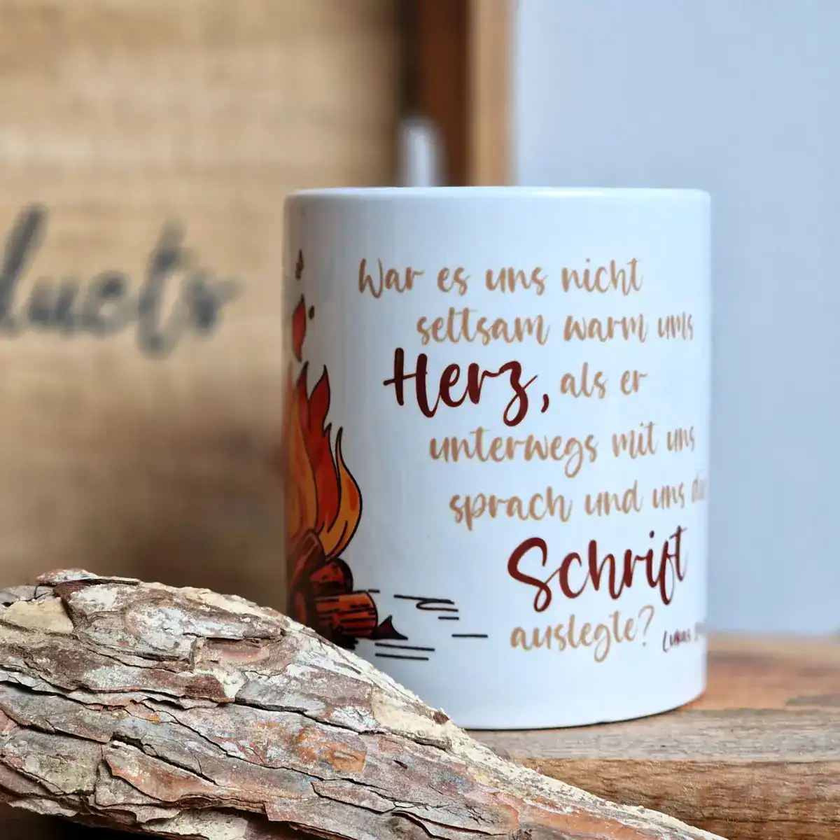 Erlebe das wärmende Gefühl von Gottes Gegenwart mit dieser besonderen Tasse. Wir haben Lukas 24, 32 aufgedruckt: „War es uns nicht seltsam warm ums Herz, als er unterwegs mit uns sprach und uns die Schrift auslegte?“. Die liebevoll gestaltete Lagerfeuer-Illustration bringt die Wärme dieser Begegnung in deinen Alltag und lädt dich ein, über Gottes Wort nachzudenken, während du deinen Tee oder Kaffee genießt.